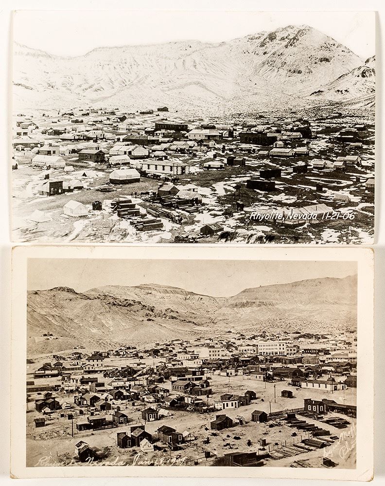 Both photos are overviews of the town. 1) photo by Egan Moffitt. Circular stamps--Rhyolite Ghost Town Nevada 2) Rhyolite, Nevada, 11-21-06, probably 1906. Back of card has drawing of a street and buildings labeled by hand. (Prag Collection) City: Rhyolite State: Nevada Date: ID# 44629