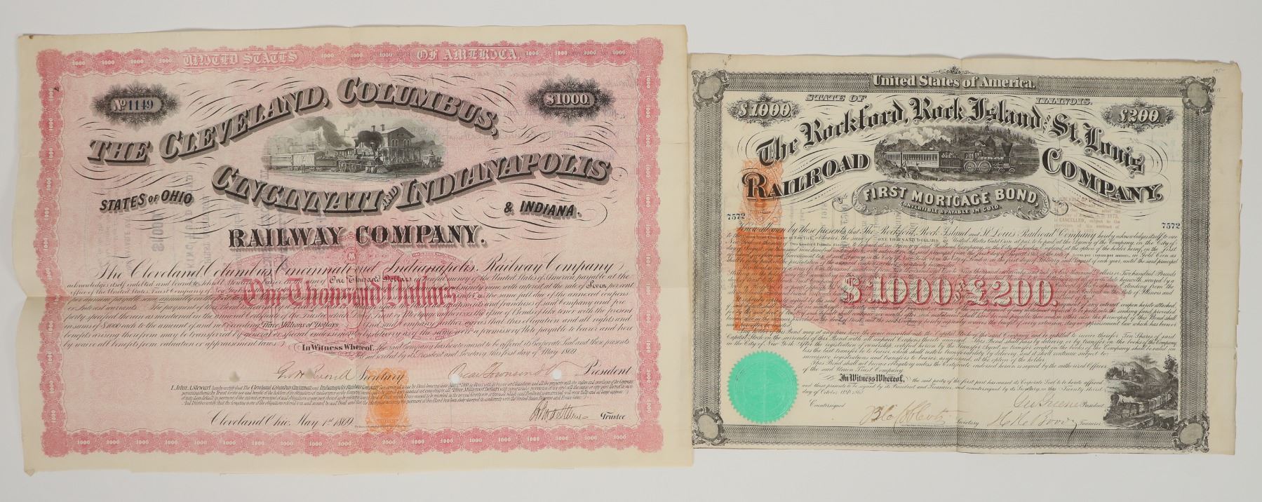 Lot of 2. 1.I/C, The Cleveland, Columbus, Cincinnati and Indianapolis Railway Co.. $1000, 7 %, issued 1869, vignette of train at depot top center. embossed seal. scarce RN orange underprint bottom center, 5 cents. Major & Knupp Engraving printers. EF. 2. I/U. The Rockford, Rock Island, and St Louis Railroad Co. $1000, First Mortgage, gold bearer bond, 7%, issued 1868, two vignettes of trains, green embosses seal, Scarce RN orange underprint left side 5 cent and One Dollar. Henry Seibert & Bros. printer. VF