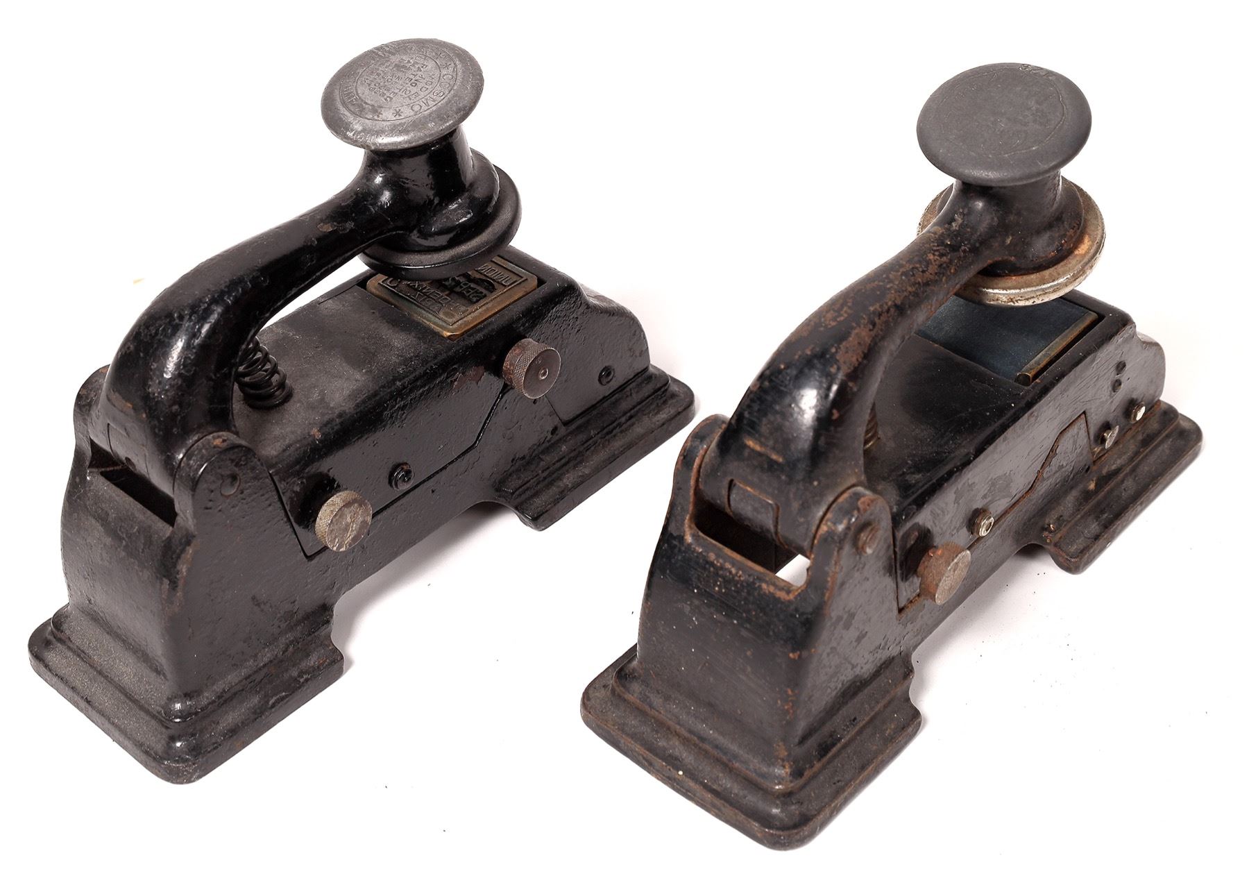 Lot of two different railroad ticket stamps. One is a dated ticket stamp from the Union Depot in Phoenix, Arizona. This depot was a stop for the Atchison, Topeka, and Santa Fe Railroad. The other stamp is from the Denver-Rio Grande System. Both are in good condition and still work. Approx. 8.25 x 3 x 5.5 inches.