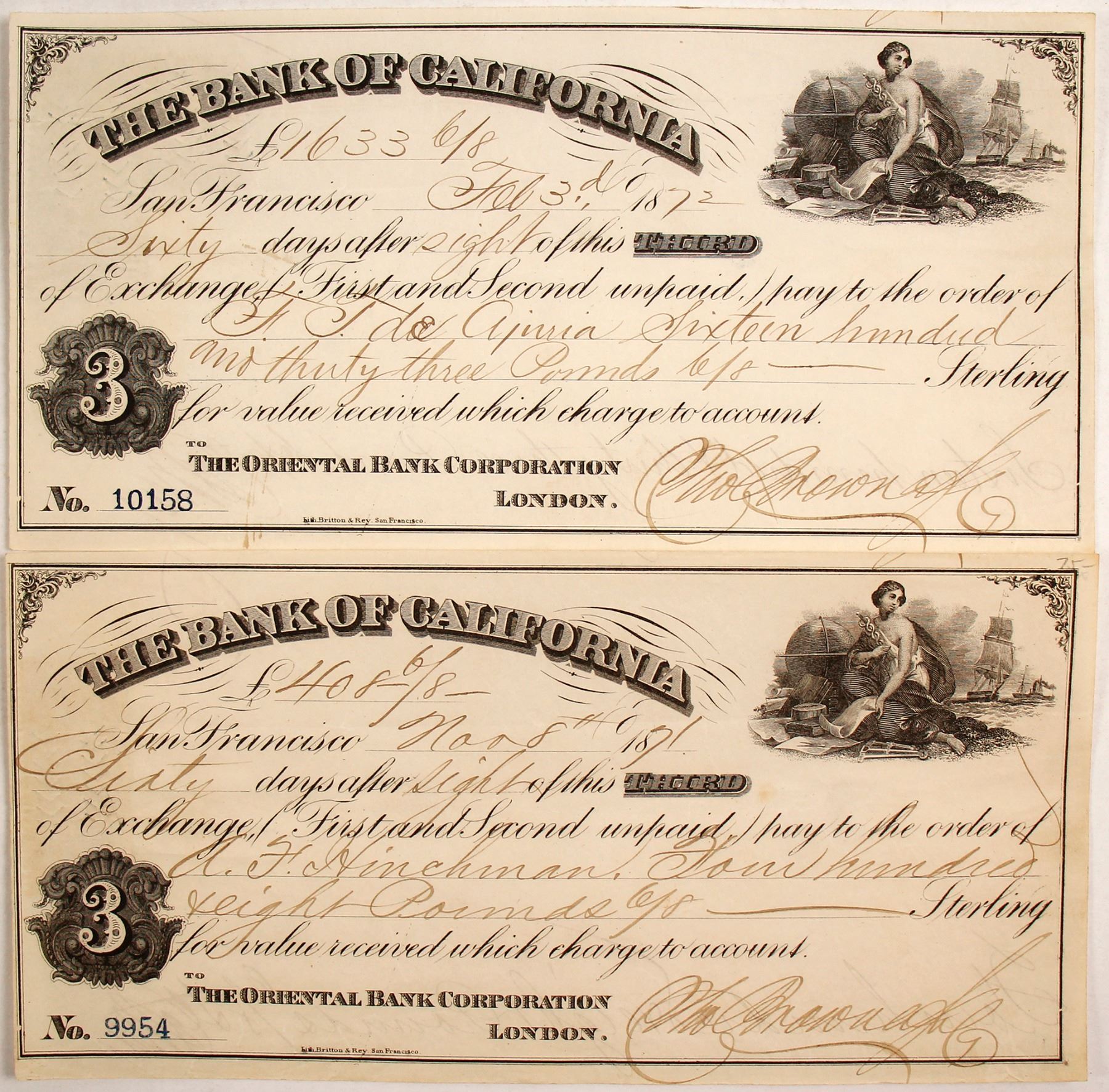 Two rare Third of Exchange from the San Francisco Bank of California office. Both to be drawn on the Oriental Bank Corporation in London. Issued in 1871 for 408 6/8 pounds sterling, and in 1872 for 1,633 6/8 pounds sterling. Identical design with allegorical vignette by Britton & Rey. Folds.
