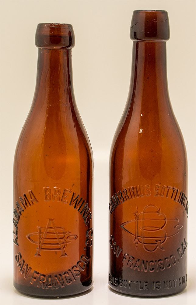 Two rare California split beers with embossed logos. Gambrinus Bottling Co., San Francisco. Clean and mint. Alabama Brewing Co., San Francisco. Clean, tiny lip chip. City: State: California Date: Inventory# 40948