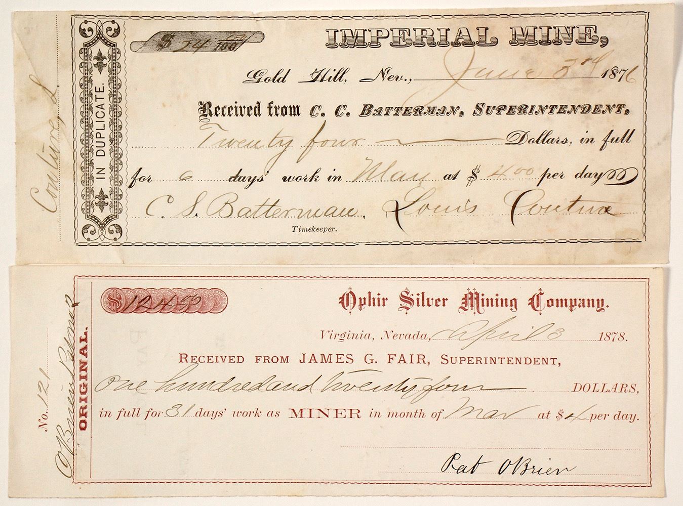 Both very scarce. 1) Ophir Silver Mining Company, Virginia City, 1878 paycheck when James G. Fair was superintendent. Fair was one of the Bonanza Kings. The Ophir was one of the earliest mines on the Comstock. Issued to Pat. O'Brien, a miner, for 31 days of work. 2) Imperial Mine, Gold Hill, 1876 paycheck when C.C. Batterman was supt. Batterman also once ran the Gould & Curry, the Crown Point, and other mines. Issued for 6 days work as a miner. The Imperial was a successful Gold Hill mine. Date: Location: Virginia City, Nevada HWAC# 572019