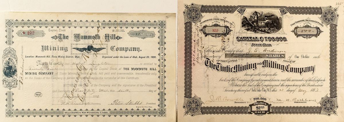 1) The Mammoth Hill Mining Company. Inc. in Utah. No. 302, issued for 25 shares to Herbert Singleton in 1893 in Provo City. Signed by the president and secretary. Pen cancelled. Eagle and miner vignette. Folds. 2) The Tintic Mining & Milling Company. Inc. in Utah Territory. No. 352, issued for 500 shares in Salt Lake City in 1893. Signed by Rathbone (president) and Bowdle (secretary). Pen cancelled. Mining vignette. Folds and light toning. (Prag Collection) City: Tintic Mining District State: Utah Date: 1893 hwac# 34336