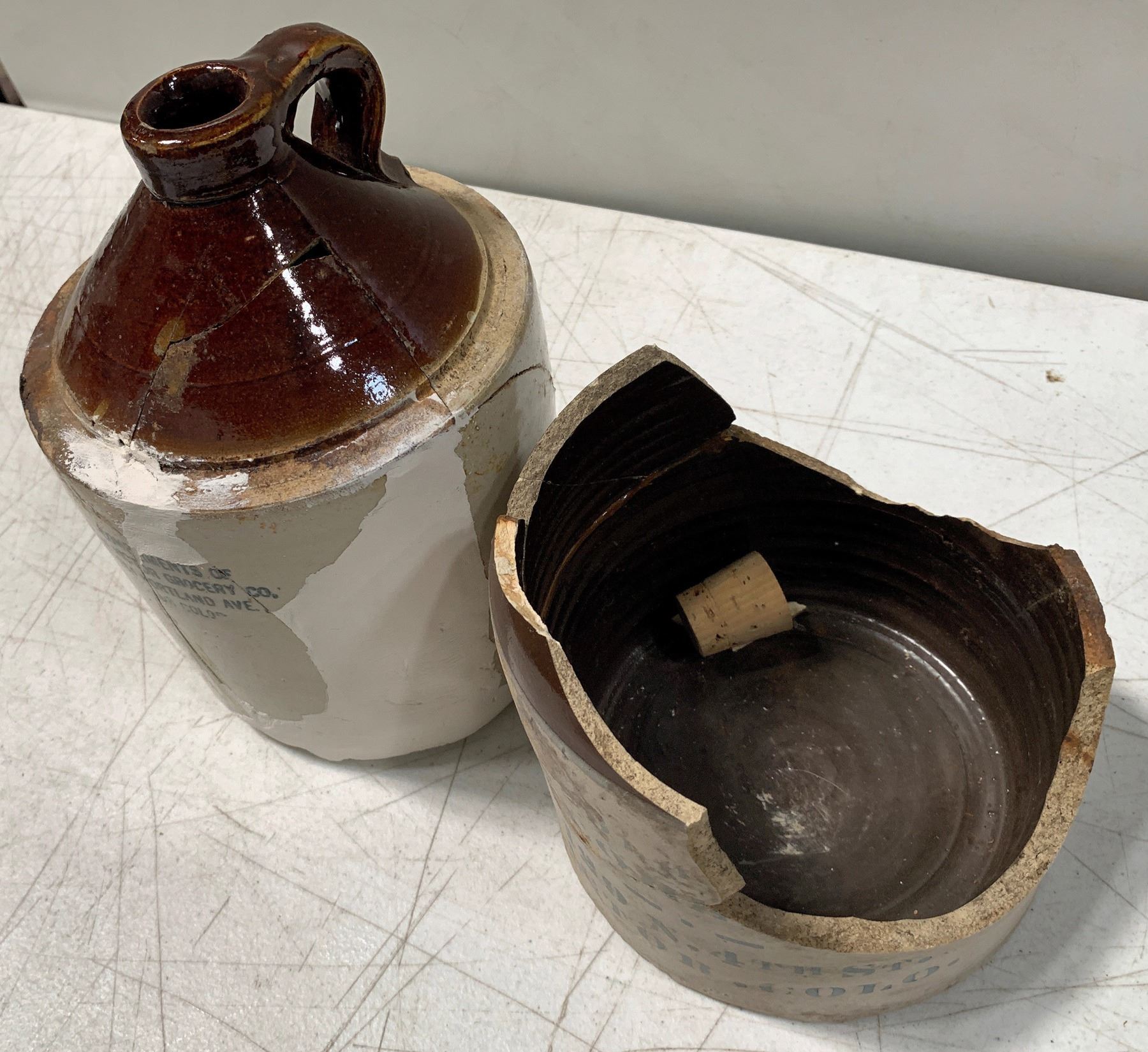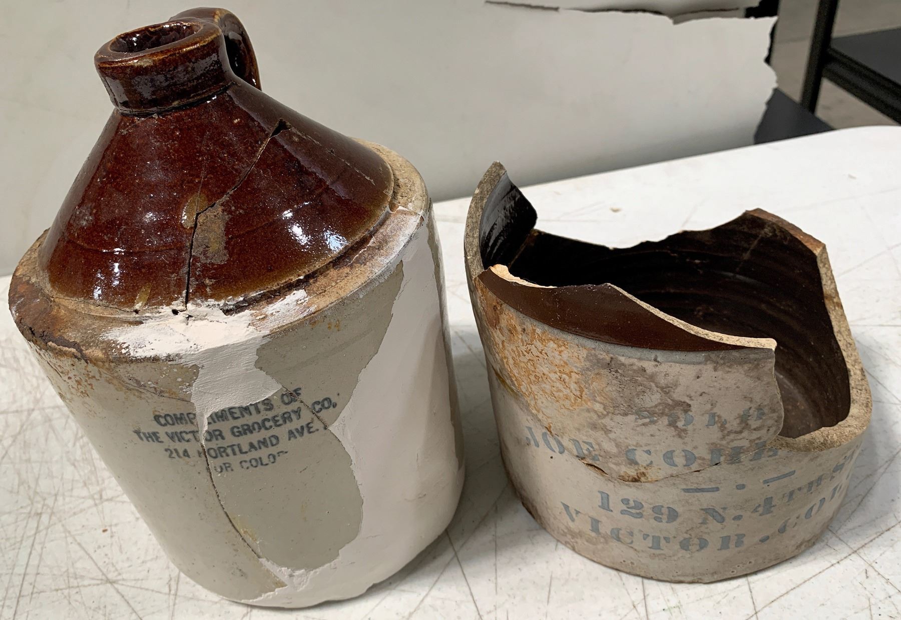 Lot of 2. 1) Victor Grocery Co. Glued together and repaired. Unlisted in Preble. 2) J-255. Joe Cohen. Bottom 1/3 of jug only.