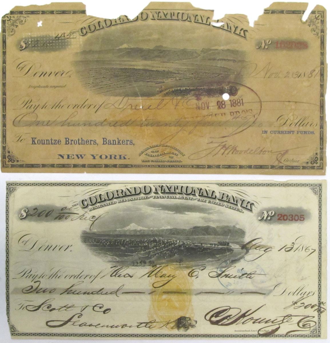 Two different. 1) 1867 draft issued for $200. Signed Kountze & Co. RN-B revenue imprint. Vignette of Denver looking west with foothills and snow-capped mountains in the distance. 4 x 8" 2) 1881 draft with RN-G revenue imprint and slightly different birds-eye vignette of Denver. To be drawn at Kountze Brothers in New York. Damaged: heavily toned and large portions missing from the top edge. Kountze came to Denver in 1862 and opened a bank with his brothers. They organized the Colorado National Bank in 1866. He is credited with saving Denver from financial ruin after a large fire burned down the city in 1867. He left Colorado in 1867 and started a bank in Manhattan. Date: 1867 & 1881 Location: Denver, Colorado HWAC# 66084
