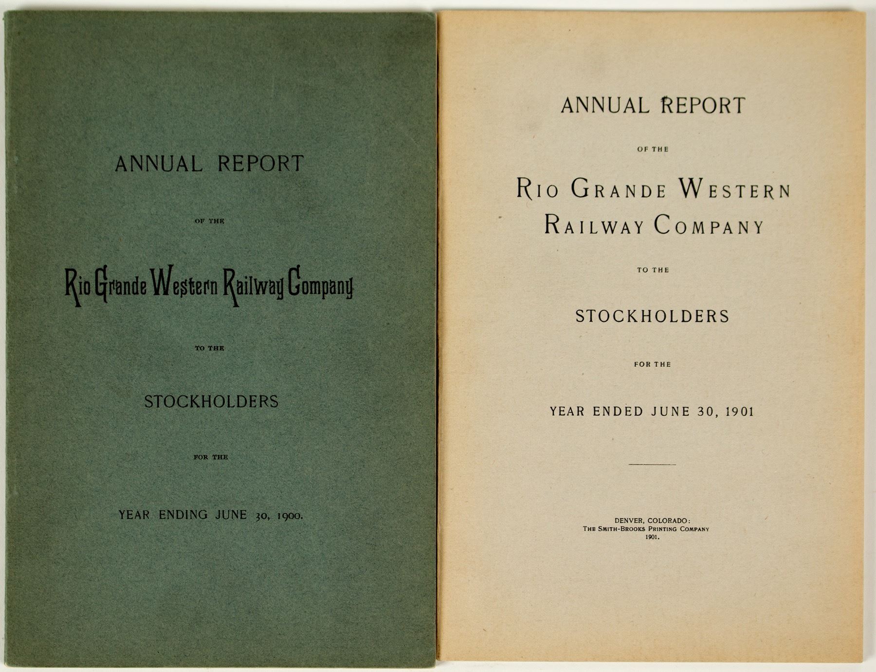 Two Rio Grande reports: Annual Report of the Rio Grande Western Railway Company for the Year Ending on June 30, 1900 and 1901. The 1900 report is 55 pages. 9 x 6". Charts, list of equipment, etc. State: Colorado City: HWAC#: 42262 Date: 1900, 1901