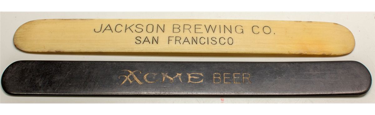 1) Acme Beer. Black. 9" long. 2) Jackson Brewing Co./ San Francisco written on both sides. 9" long. Soiling from use. The Jackson Brewing Company was founded in 1859 by Thomas Green and Jacob Lyon. It shut down during Prohibition, when it was the last remaining family-owned and operated brewery dating from SF's 1850s beginnings. Burt Collection