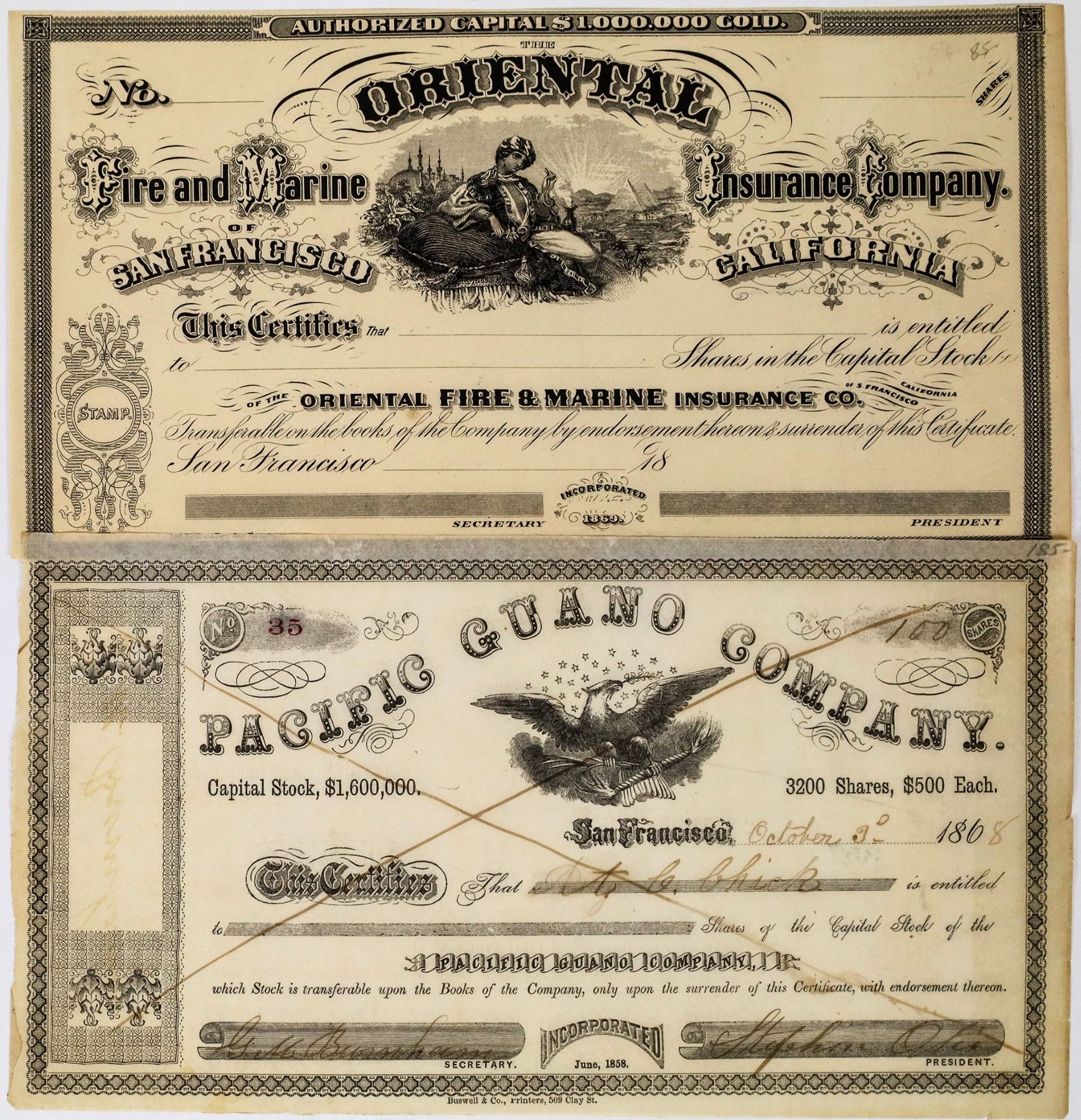 Lot of 2 different. 1) Pacific Guano Company. No. 35, issued in 1868 for 100 shares to Chick. Signed by president Stephen Otis and secretary Burnham. Pen cancelled. Black border and print, eagle on shield vignette. The Pacific Guano Company was for twenty-six years (1863 v±1889) the principal industry of Woods Hole. It was the result of the association of the Boston shipping firm of Glidden and Williams and two Cape Cod families. The islands along the west coast of South America were found to have guano (bird dung) several hundred feet thick, which was used in fertilizer. 2) Oriental Fire and Marine Insurance Company. Unissued. Great vignette of Egyptian man with pyramids in the background. Britton & Rey, SF.