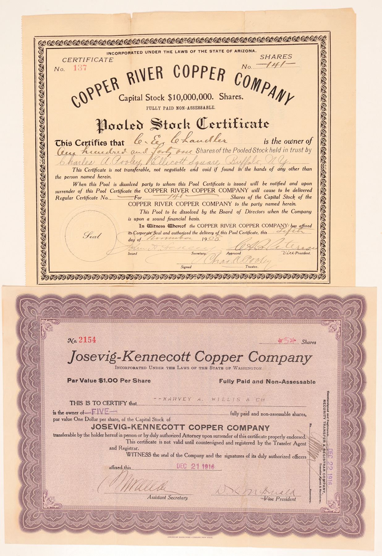 Two Alaska Mining Scams! 1) Josevig-Kennecott Copper Company. #2154. Signed by McDonald as president. Black on purple and not cancelled. Said to have 19 lode claims, 1 placer claim and 7 miles from Kennecott, Alaska. Glowing reports were made regarding this property by the promoters which appear to have been a misrepresentation of fact. One statement is said to have claimed that the mine was superior to the Kennecott Copper Corporation. More conservative estimates made by the consulting engineer give a very small tonnage of ore averaging about 3 1/2% copper. Due to location transportation difficulties small amount and grade of etc the future of this property is uncertain. By 1919 Josevig, McDonald, etc were under Federal Government Grand Jury indictments. [Mines register] 2) nc. in Arizona. No. 137, not cancelled. Issued for 141 shares to CE CHandler on November 15th, 1908. Signed by Peterson (vice president), trustee Charles Pooley and the company secretary. Very plain stock: no vignette, black border. 8.5" x 10" Condition: folds. According to the 1907 Copper Handbook, this company is "a brazen swindle, and its promoters should be in jail" (pg. 537). Ken Prag Collection