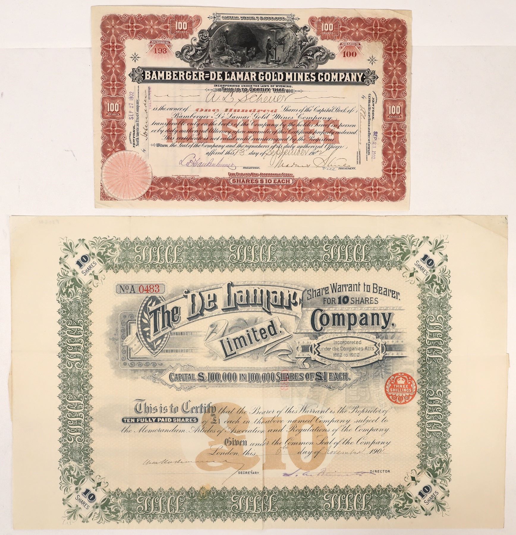 Two nice Delamar, Nevada pieces that are seldom seen. 1) De Lamar Company, Limited Share Warrant to Bearer for 10 shares issued in London in 1901. Two coupons remain at the bottom. 2) Bamberger=De Lamar Gold Mines Company stock issued for 100 shares in 1902. Engraved by Franklin Lee Bank Note, New York. Nice mining vignette of miners working underground. This one we don't think we've seen before. Gold was discovered at De Lamar in 1890 and the Ferguson district was organized in 1891. The district's fortunes rose when Capt. John De Lamar of Montana purchased the principal claims in 1893 for $150,000 (Paher, Ghost Towns & Mining Camps of Nevada). The mines at Delamar became known as the "widow makers" as many miners there died of the fatal silicosis, caused by improper ventilation of the mines. The mines were the largest producers in Nevada for a five year period due to a lull in the state overall. Capt. De Lamar sold out his position in 1902 to Simon Bamberger (hence the name on our second certificate in this lot). Bamberger installed a 400 ton mill in 1903, and Delamar still ranked as the third largest producer in Nevada behind Goldfield and Tonopah as late as 1906. Both of the certificate are in VF condition.
