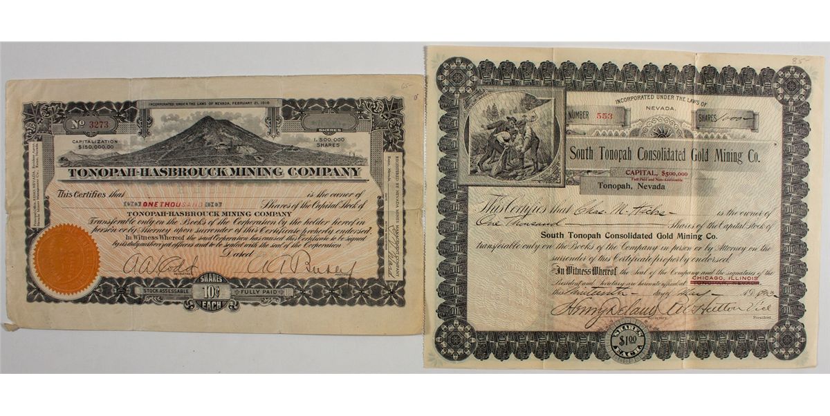 1) South Tonopah Consolidated Gold Mining Company. #553 for 1,000 shares to Charles Hicks in 1903. Very early Tonopah. Signed by Henry Delany and WS Hutton. 2) Tonopah-Hasbrouck Mining Company. #3273 for 1,000 shares to H. H. Blair. Signed by AA Codd and AA Busey. No date. Ten assessment payments receipts on back. According to Shamberger, Codd was a heavy promoter of Weepah; during earlier years Codd was active in Rawhide (president of the Rawhide Mining Company and Codd Mining Co.) and he was also a heavy promoter in Goldfield.City: TonopahCounty: NyeState: NVDate:
