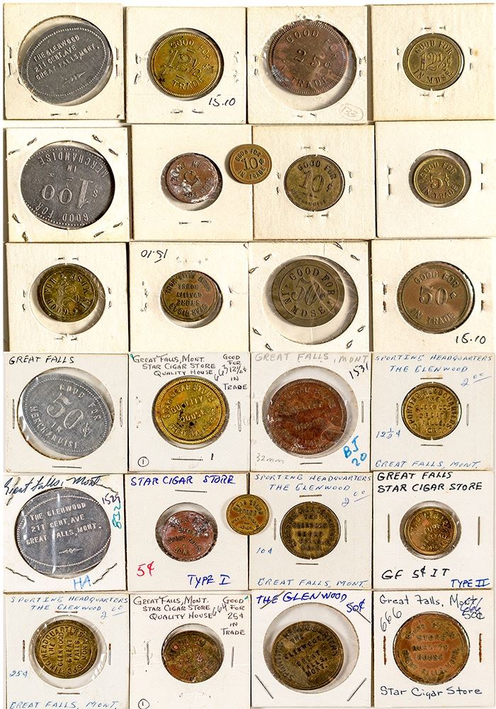 One set: The Glenwood Sporting Headquarters // 10c, 12 1/2c, 25c, 50c (all brass) 50c, $1.00 (aluminum). Second set: Star Cigar Store // 2-5c, 10c, 12 1/2c, 2- 25c, 50c. (Svoboda Collection) City: Great Falls State: Montana Date: HWAC# 33867