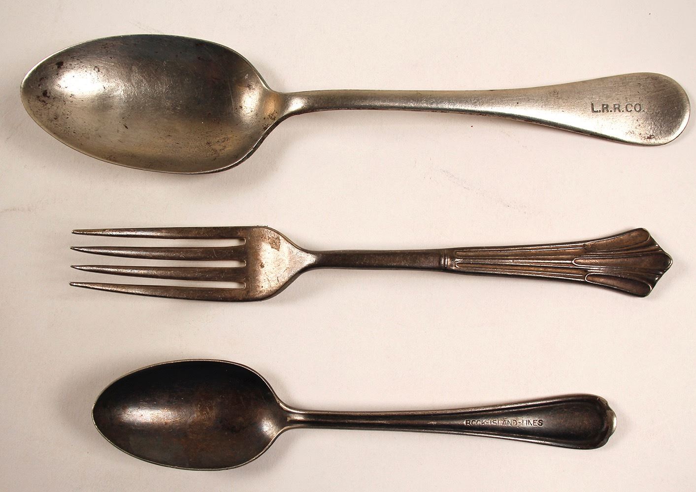 FRED HARVEY marked ornate 7 silver-plated fork by International Silver; circa 1920s., ROCK ISLAND Lines marked 6 silver-plated spoon by R.W circa 1930s., L. R. R. CO. marked 8 silver-plated spoon; also marked O. C. Nickel Silver; origin not certain; circa 1920s-1930s. Date: Location: HWAC# 57256