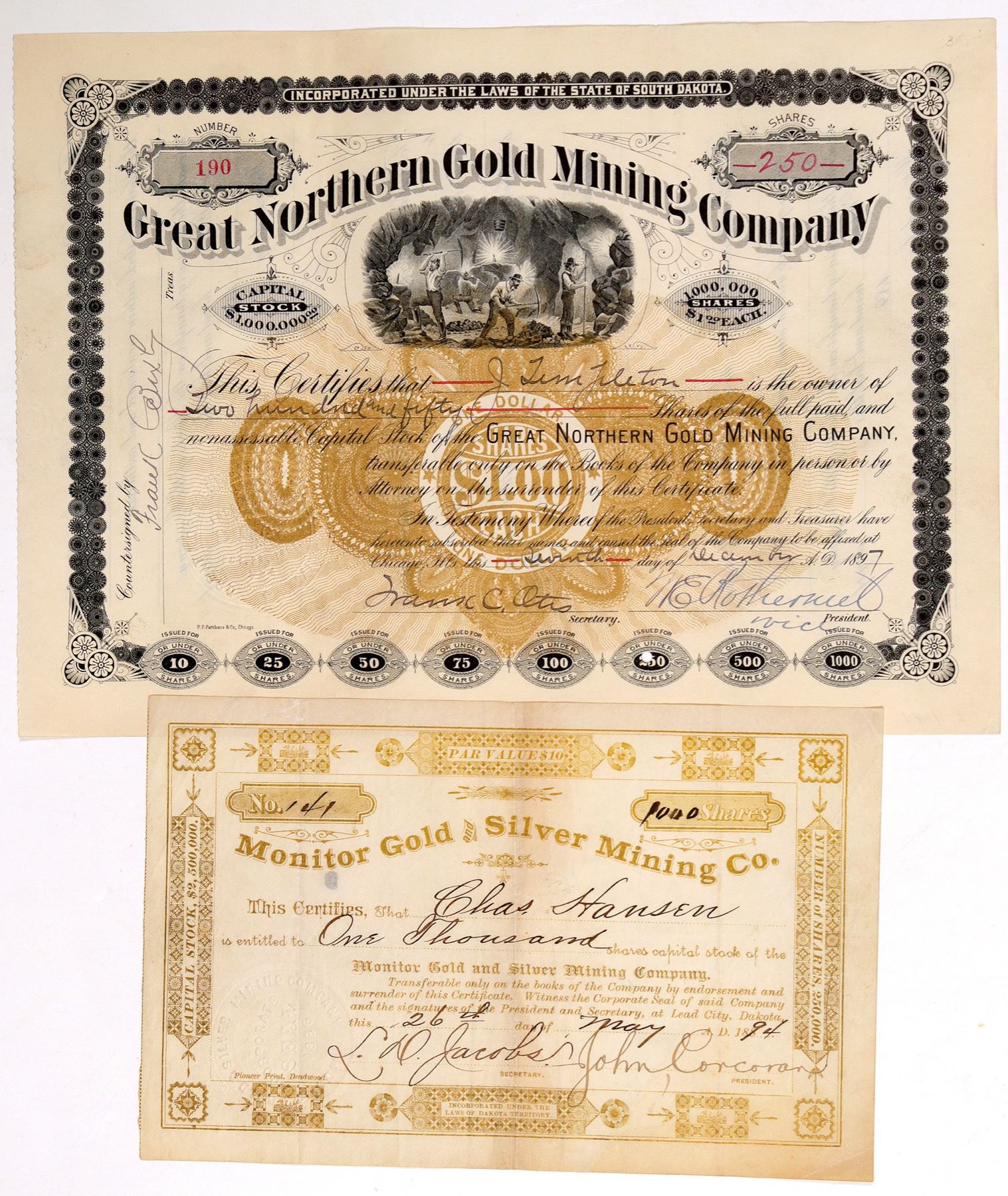Lot of 2 different. 1) Monitor Gold and Silver Mining Company. No. 141, issued for 1,000 shares to Chas. Hanson on May 26th, 1894 at Lead City. Signed by president John Corcoran and secretary L.H. Jacobs. Not cancelled. Gold border and print. Pioneer Print, Deadwood. Deep folds, bent corners. 5.5 x 8.5" Inc. 1886. Lead City, Lawrence County. 2) Great Northern Gold Mining Company. Inc. in South Dakota. No. 190, issued for 100 shares to J. Templeton on Dec. 7th, 1897. Signed by the vice president and secretary. Not cancelled. Mining vignette and gilt RN facsimile underprint. Folds, very fine. 8 x 11.25" () Ken Prag Collection