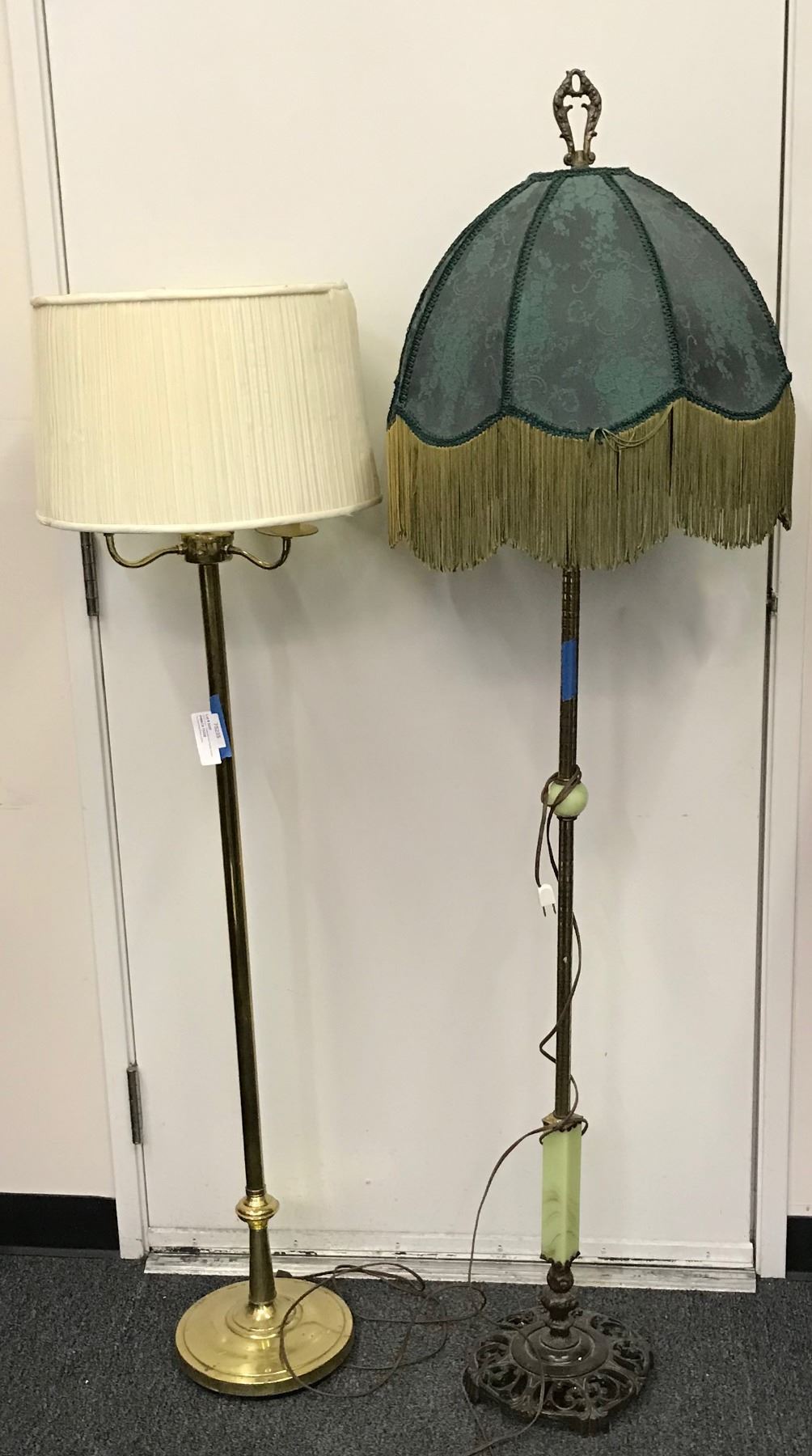 One antique, one modern. Both approximately 5 feet tall. Antique piece has green marbled plastic sections in the stand, ornate base, ornate green cloth shade with gold friends. Approximately 16 inches in diameter. State: City: Date: HWAC# 75235