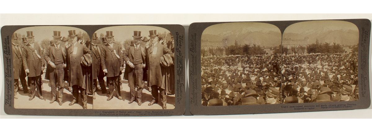 Two different Underwood & Underwood stereoviews. 1) Caption: "Chief Magistrates of Nation and of State---Pres. Roosevelt and Gov. Wells of Utah, at Salt Lake." Shows Roosevelt in top hat with two men with ribbons. Medium contrast. 2) Caption: "Utah's snow-capped mountains and sturdy citizens greeting President Roosevelt at Ogden." View of large crowd and mountains in distance. Medium contrast. Roosevelt's visit in May 1903 was part of a 25-state, eight-week tour of the United States. (Prag Collection)