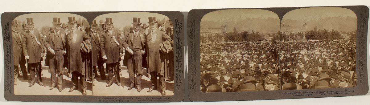 Two different Underwood & Underwood stereoviews. 1) Caption: "Chief Magistrates of Nation and of State---Pres. Roosevelt and Gov. Wells of Utah, at Salt Lake." Shows Roosevelt in top hat with two men with ribbons. Medium contrast. 2) Caption: "Utah's snow-capped mountains and sturdy citizens greeting President Roosevelt at Ogden." View of large crowd and mountains in distance. Medium contrast. Roosevelt's visit in May 1903 was part of a 25-state, eight-week tour of the United States. (Prag Collection) City: Salt Lake City State: Utah Date: 1903 ID# 27126
