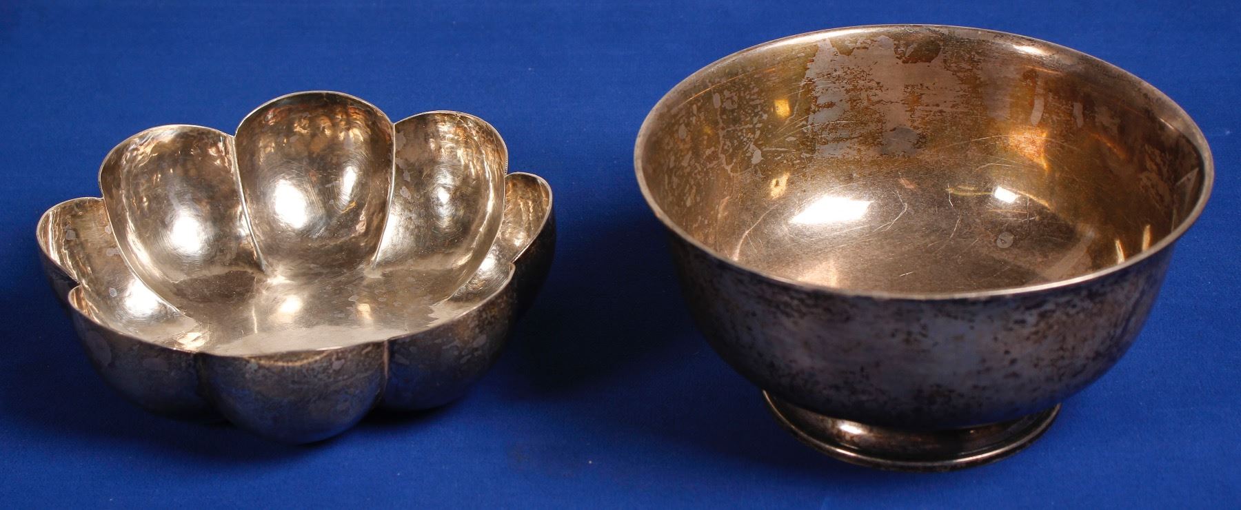 1) Scalloped bowl. 7" diameter. 2" tall. Sterling. 2) Round bowl. 7 x 3.5". Hallmarked "Sterling / Fred Hirsch Company / 937X". Hirsch was located in Jersey City. Operated 1920-1945. Date: City: State: HWAC# 58248
