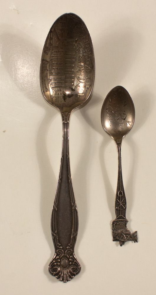 1) 5.5" long. Bowl of spoon has engraving showing impressive building. "Court House, Santa Rosa, Cal." Reverse says sterling with an 1894 patent date. 2) Cute smaller spoon (3.5" long). Bowl has engraving "Santa Rosa, Cal." Handle of spoon has a miner's mule loaded with mining items, including something labeled "Dynamite." Reverse says sterling. Prag Collection