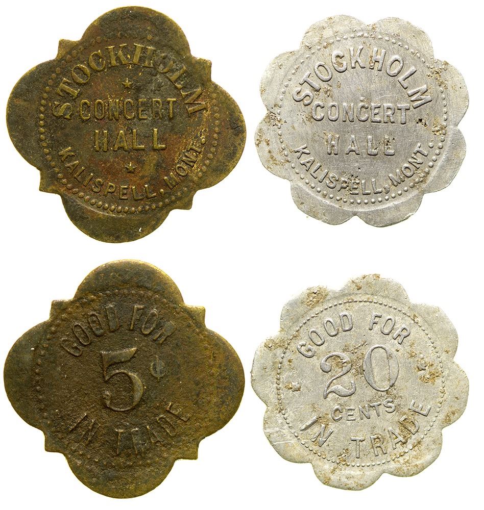 1) Stockholm / Concert / Hall / Kalispell, Mont. // GF / 5c / IT. 4 scallops with points between, brass, 30mm. 2) Stockholm / Concert / Hall / Kalispell, Mont. // GF /20c / IT. 8 scallops aluminum, 30mm. (Svoboda Collection) City: Kalispell State: Montana Date: HWAC# 35812