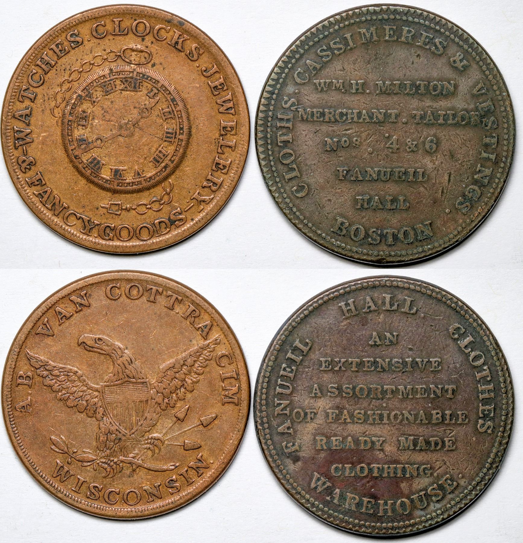 Two copper store cards, 1-1/8 inch diameter, Van Cottra Cim, Wisconsin, and Wm. Milton Merchant Tailor, Boston, Mass.