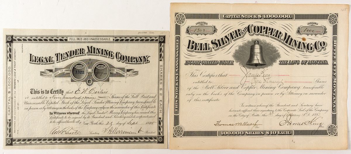 1) Bell Silver and Copper Mining Company. Inc. in Montana. Issued in 1883 for 1,000 shares to the president, James King. Vignette of cracked liberty bell. Not cancelled. 8.5" x 11.5" Toning around edges. 2) Legal Tender Mining Company. Inc. in Montana Territory. Issued 1885. Not cancelled. 7" x 10.5" (Prag Collection) City: State: Montana Date: 1883 & 1885 HWAC# 34112