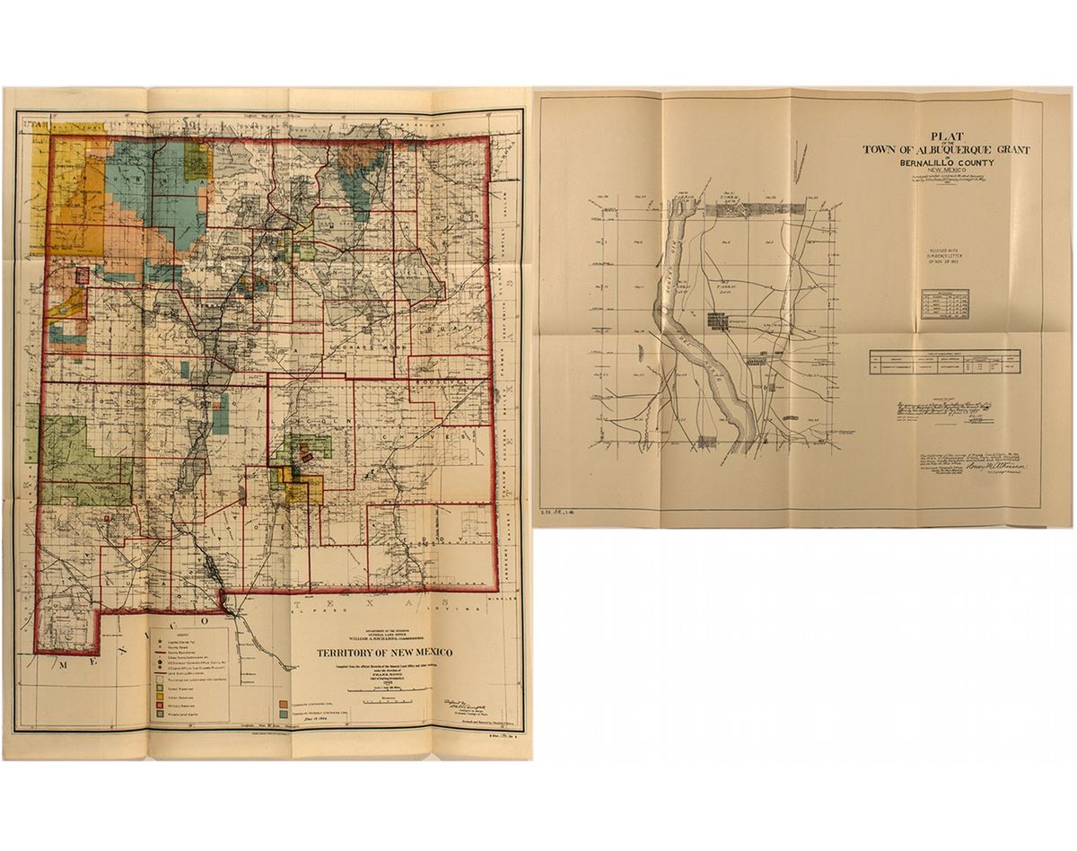 1) Department of the Interior General Land Office William A. Richards, Commissioner. Territory of New Mexico. Compiled under the direction of Frank Bond, Chief of Drafting Division, 1903. Nicely colored map shows Townships not subdivided into sections. Forest Reserves, Indian Reserves, Military Reserves and Private Land Grants, color coded. 923.5" x 18.5"). 2) Plat of the Albuquerque Grant in Bernalillo County, New Mexico. Surveyed under contract No. 184 of January 16, 1883 by John Shaw, U. S. Deputy Surveyor. (15.5" x 19.5").