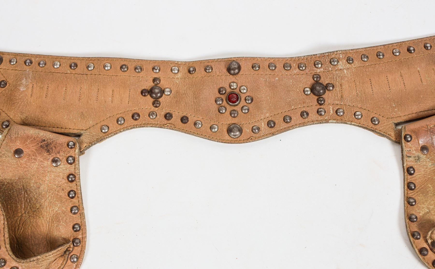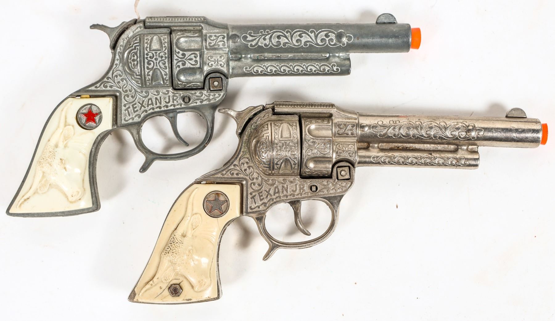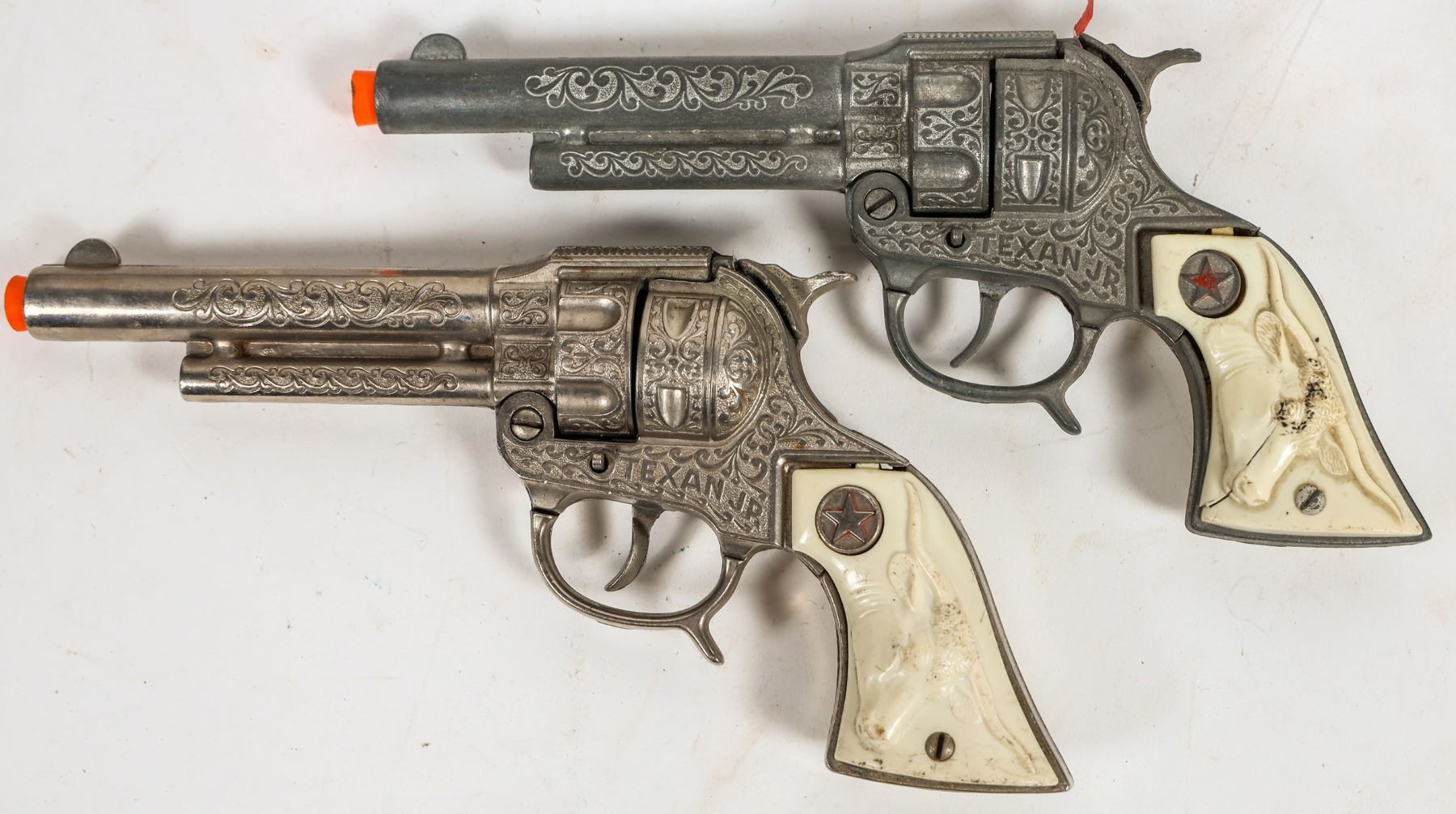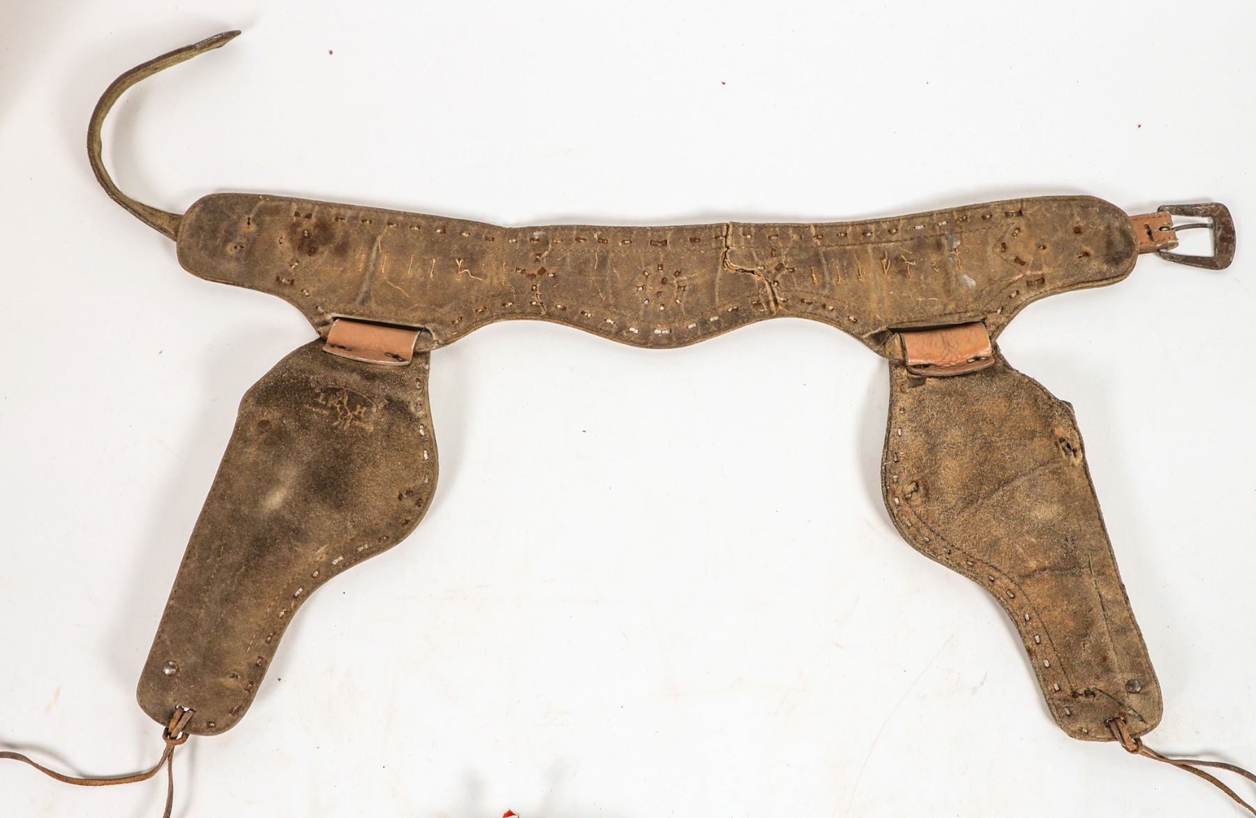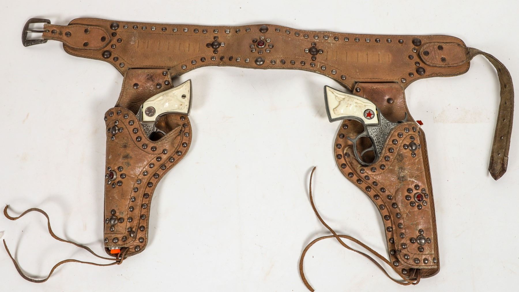 There are two Hubley "Texas Jr." cap pistols set into two LH Brand leather holsters and belt. The belt bullet loops now gone. The leather is very supple. Gun in good condition. Please see photo for details.