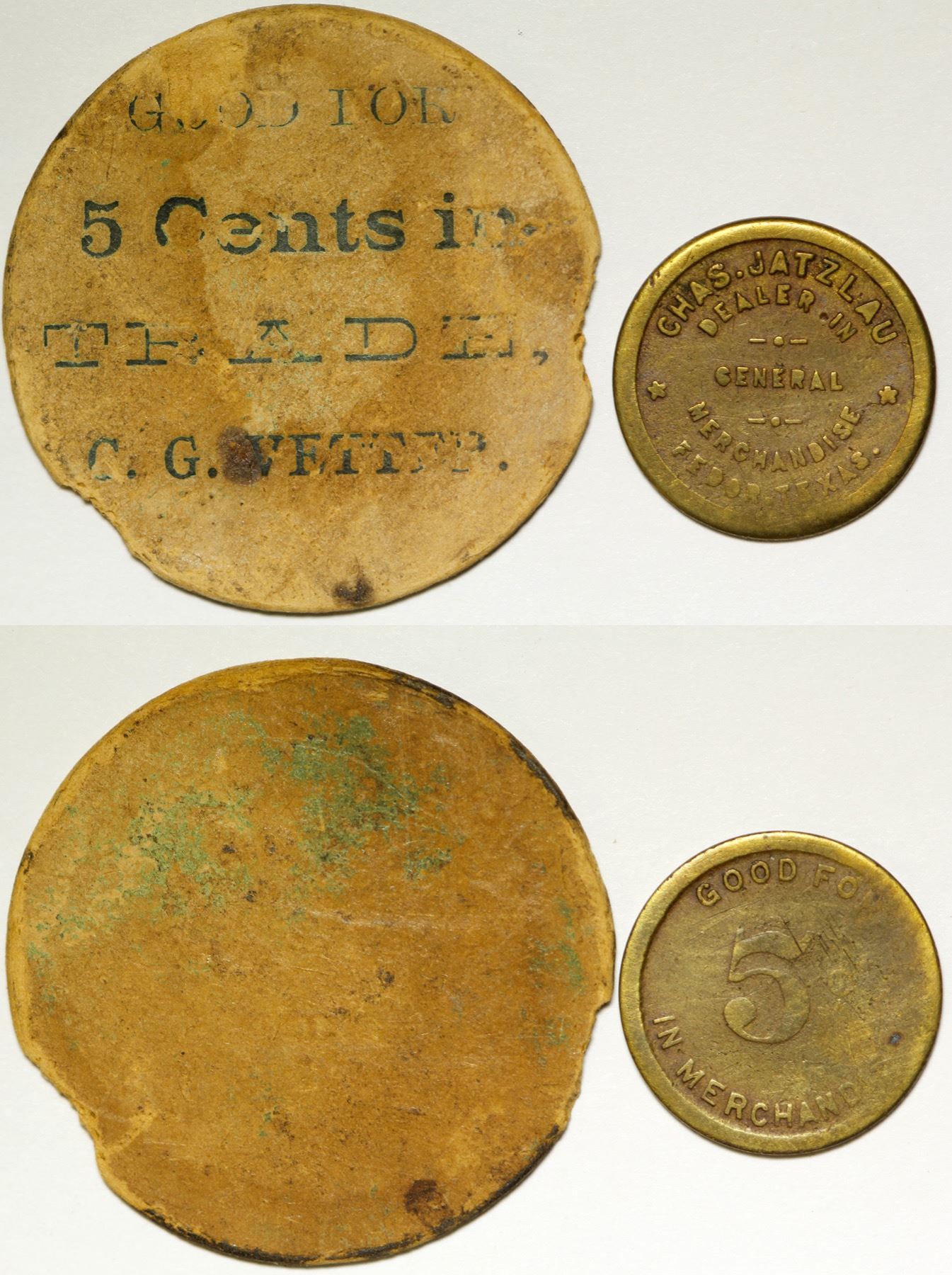 Lot of two: 1) Obv.: Chas. Jatzlau / Dealer / In / General / Merchandise / Fedor, Texas; Rev.: Good For / 5c / In Merchandise. Br., rd., `19 mm. 2) Good For / 5 Cents in / Trade / C.G. Vetter. Cardboard. State: Texas City: Fedor/Fayetteville Date: HWAC# 81471