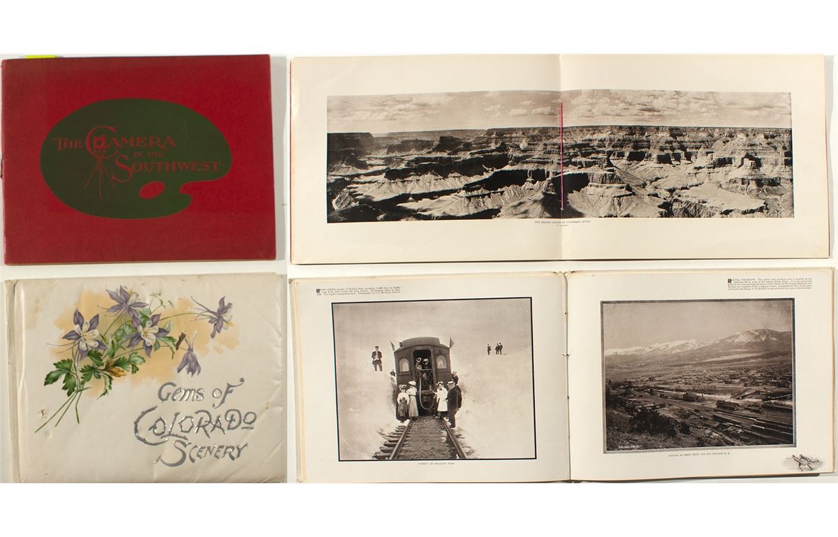 Two Frank S. Thayer published books. 1) Gems of Colorado Scenery. White leather hardcover with hand-painted lupine flowers on cover and aluminum lettering. 13th edition. From Original Photographs by L.C. McClure and Smith-Hassell Co. Denver. Wash drawings by George Berger. Rips and chips to covers, along with staining. Some of the pages have also been stained. 10.5" x 13.5" 2) The Camera in the Southwest. Softcover with string binding. Second edition, 1904. Published by Thayer, put out by The Colorado News Company in Denver. Views of Sante Fe, Laguna, Albquerque, Pima, Papago and Pueblo Indians, the San Francisco Mountains, the Grand Canyon, Canon Diablo trestle, Cliff Dwellings, heiroglyphics near Prescott, cacti, Phoenix, El Paso, and the petrified forest in Arizona. Small creases. Overall very nice. 10.5" x 13.5"