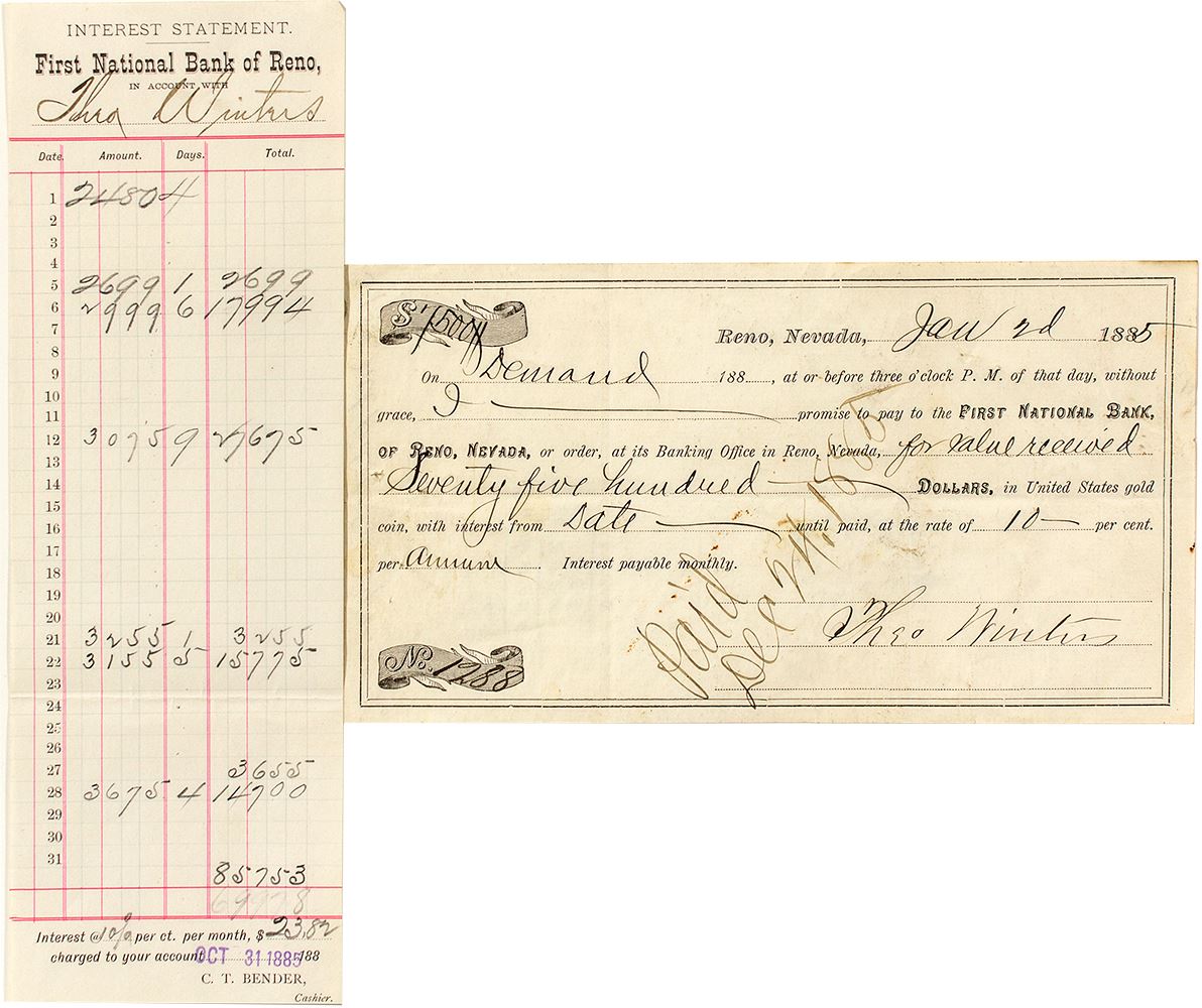 1) First National Bank of Reno loan document. Theo. Winters is borrowing $7,500 on Jan. 2, 1885. Paid Dec. 24, 1885. Signed by Winters. 4.5" x 8." 2) Interest Statement from the First National Bank of Reno for Theo. Winters dated Oct. 31, 1885. 9.75" x 3.25."