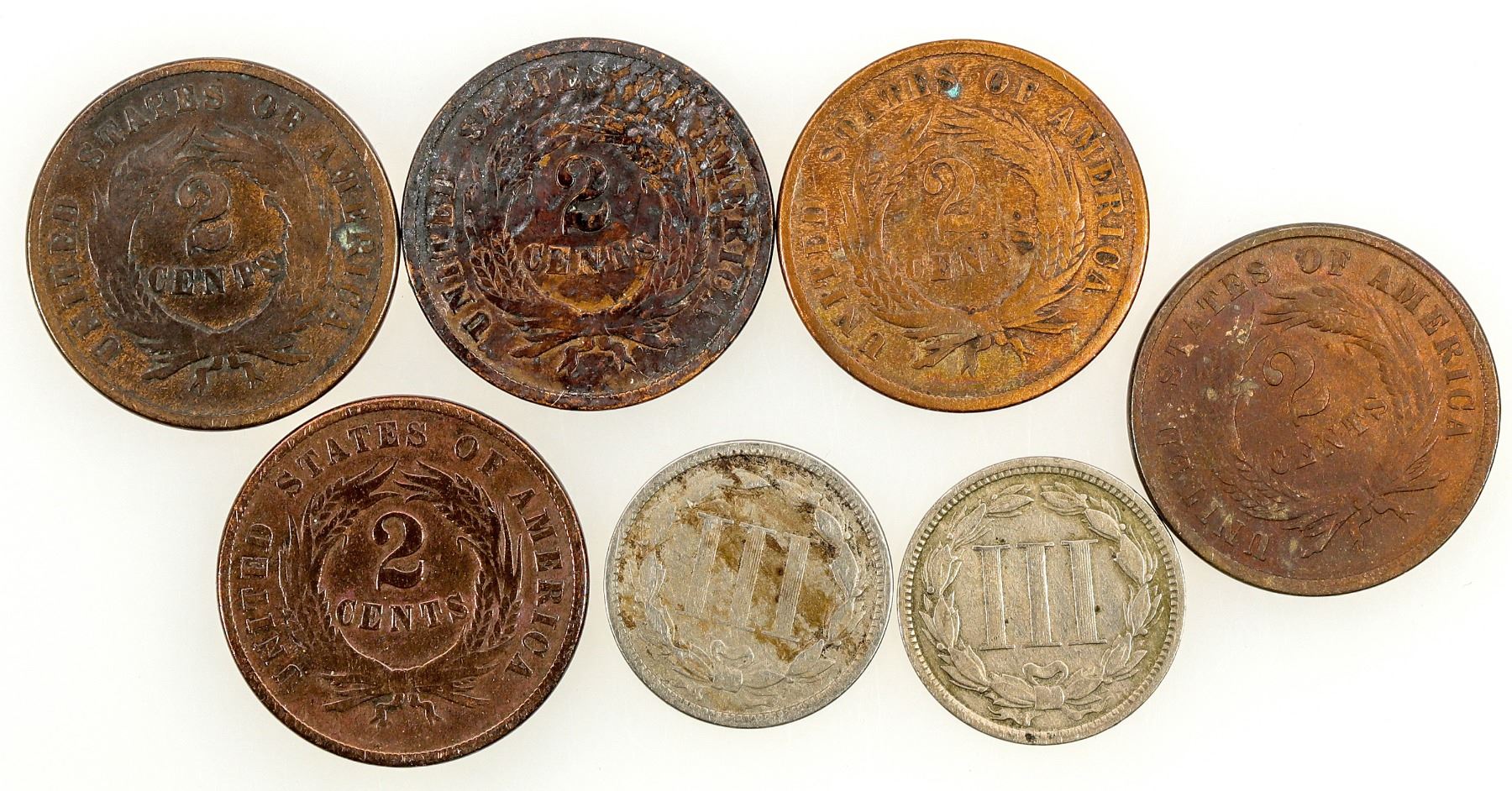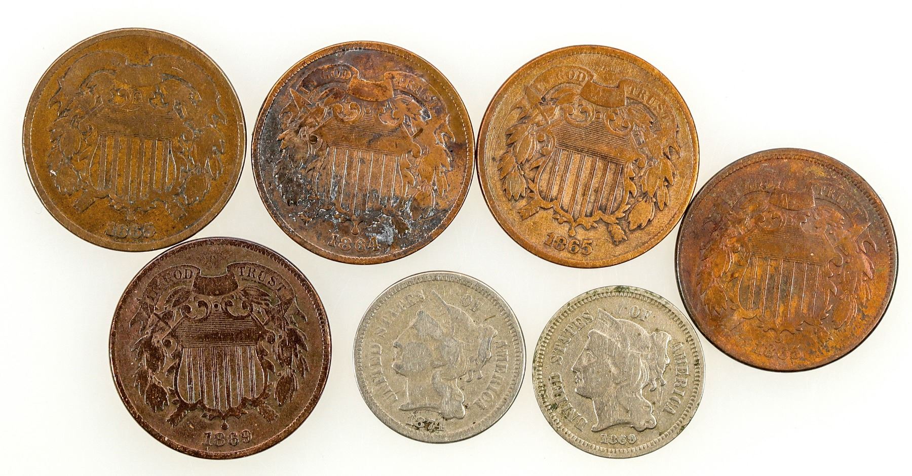 Lot of seven odd denomination coins. Five two cent pieces: 1864 (VG); three 1865 (VG); 1869 (VG). Two three cent pieces: 1869 (F); 1874 (VG).