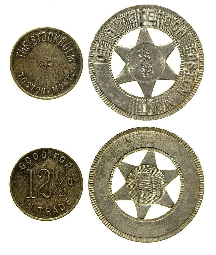1) The Stockholm // Toston, Mont. // GF / 12-1/2c / IT. White metal, round, 20mm. 2) Otto Peterson Toston, Mont. // blank. Round, aluminum, 6-point star cut-out in center. (Svoboda Collection) City: Toston State: Montana Date: HWAC# 35838