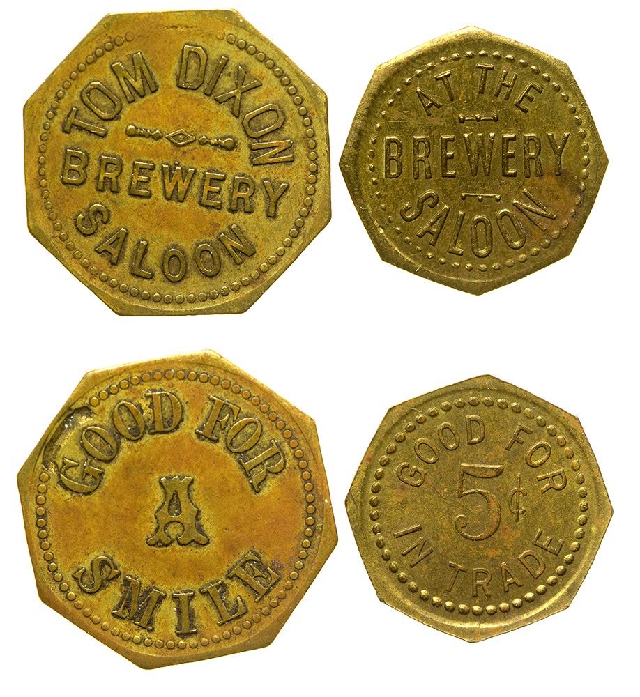 1) Tom Dixon / Brewery / Saloon // GF / A / Smile. Octagonal, brass, 24mm. 2) At The / Brewery / Saloon //GF / 5c / IT. Octagonal, brass, 20mm. (Svoboda Collection) City: Townsend State: Montana Date: HWAC# 35844
