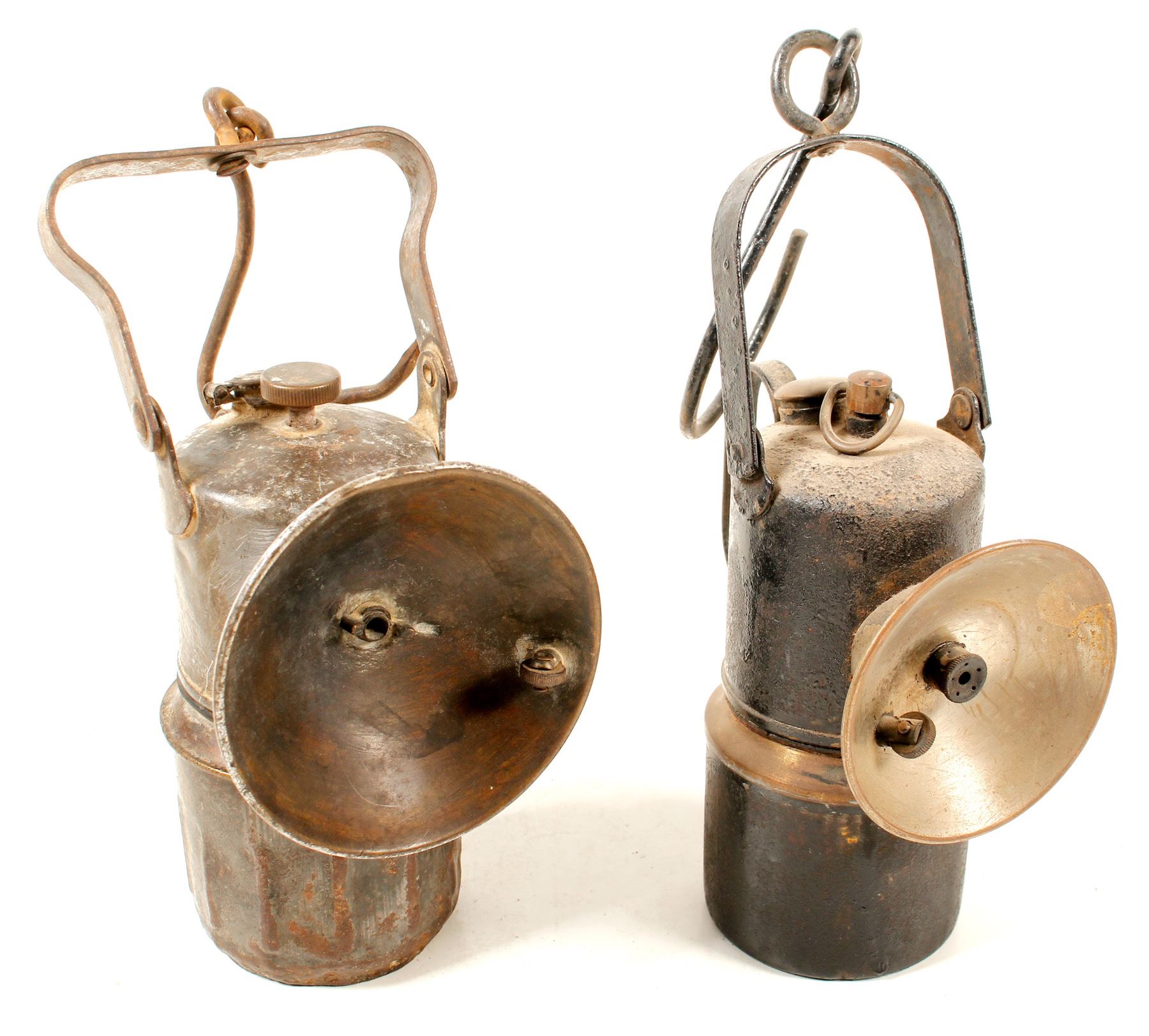 Two unmarked carbides in the style of Justrite and Dewar. Both heavily used. Please see photo. State: City: HWAC#: 47247 Date: