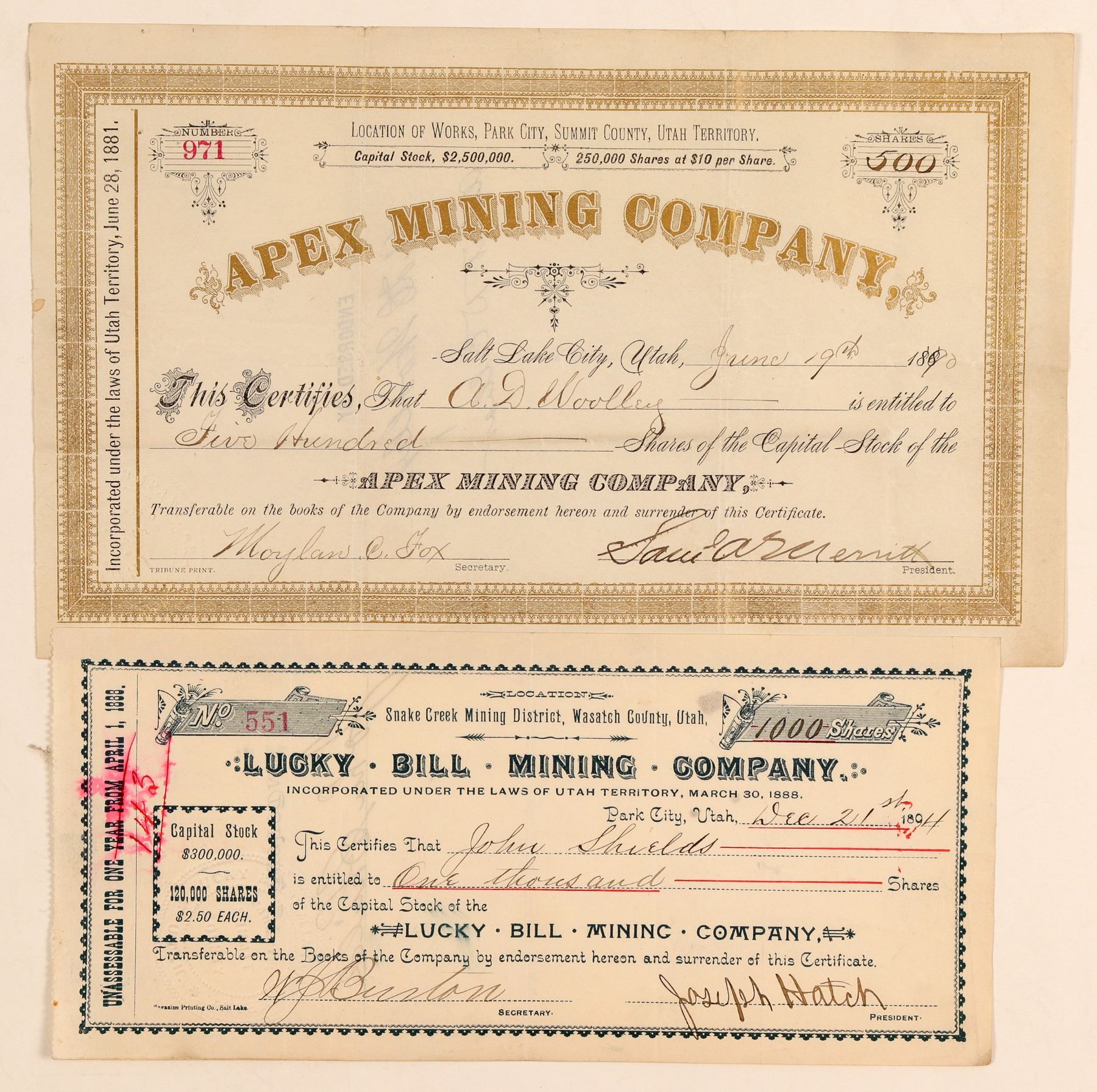 Lot of 2 different. 1) Apex Mining Company. Location of Works, Park City, Summit Count, Utah Territory (printed at top). No. 971, issued for 500 shares to A.D. Woolley on June 19th, 1890. Signed by the president (Sam. McDermitt ?) and secretary Moylans Fox. Not cancelled. Gilt border and title. Black print. Pinholes, horizontal and vertical folds. 2) Lucky Bill Mining Company. Snake Creek Mining District, Wasatch County, Utah (printed at top). Inc. in Utah Territory, March 1888. No. 551, issued for 1,000 shares to John Shields on Dec. 21st, 1894 in Park City. Signed by president Joseph Hatch and secretary Burton. Not cancelled. Blue border and print. Numerous folds. Red ink smear. Ken Prag Collection