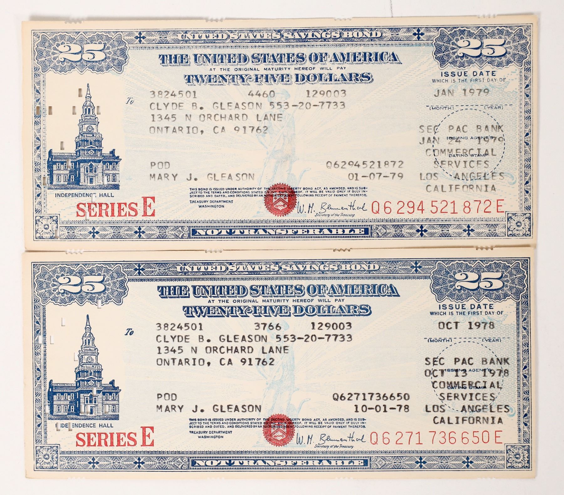 Two (2) United States Savings Bonds, each issued in 1979 and each in the amount of $25. They are series E and still valid and not endorsed. Please see photos for more details. 1979