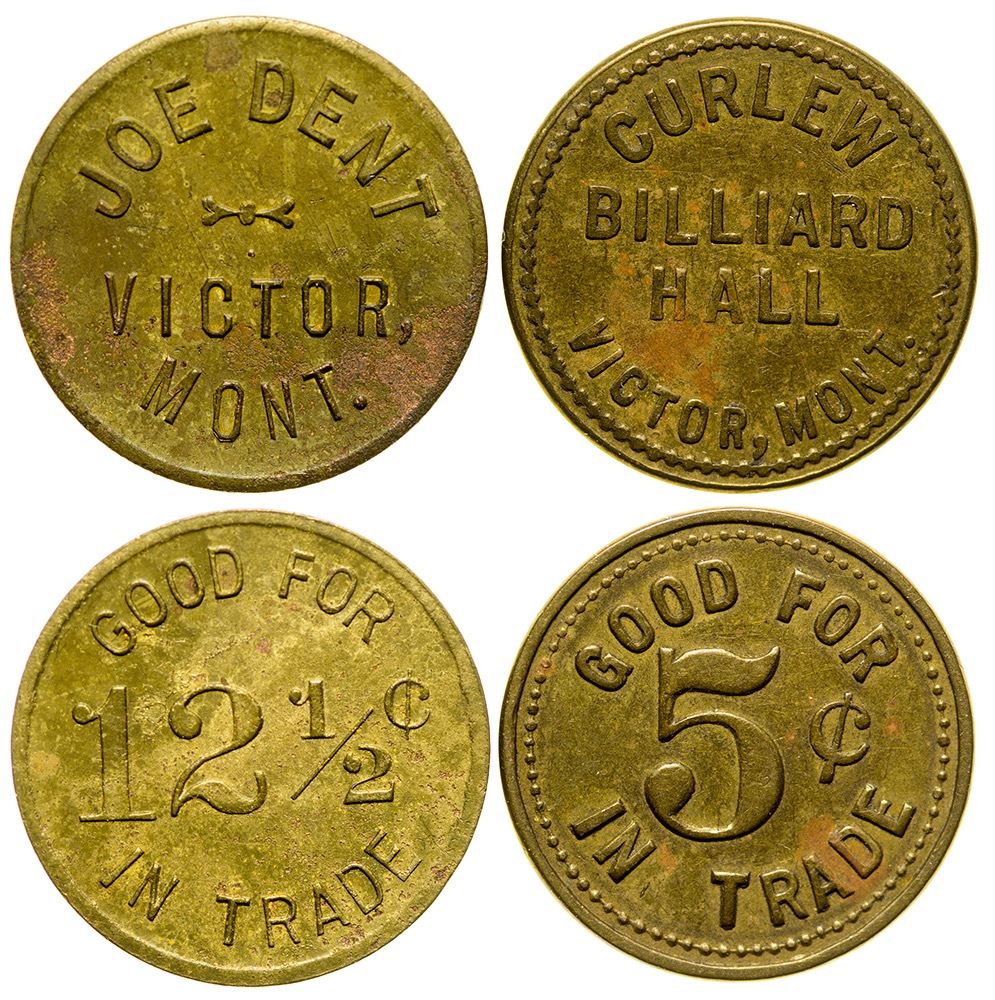 1) R-7. Curlew / Billiard / Hall / Victor, Mont. // GF / 5c / IT. Brass, round, 20mm. 2) R-7. Joe Bent / Victor / Mont. // GF / 12 1/2c / IT. Brass, round 21mm. (Svoboda Collection) City: Victor State: Montana Date: HWAC# 35036