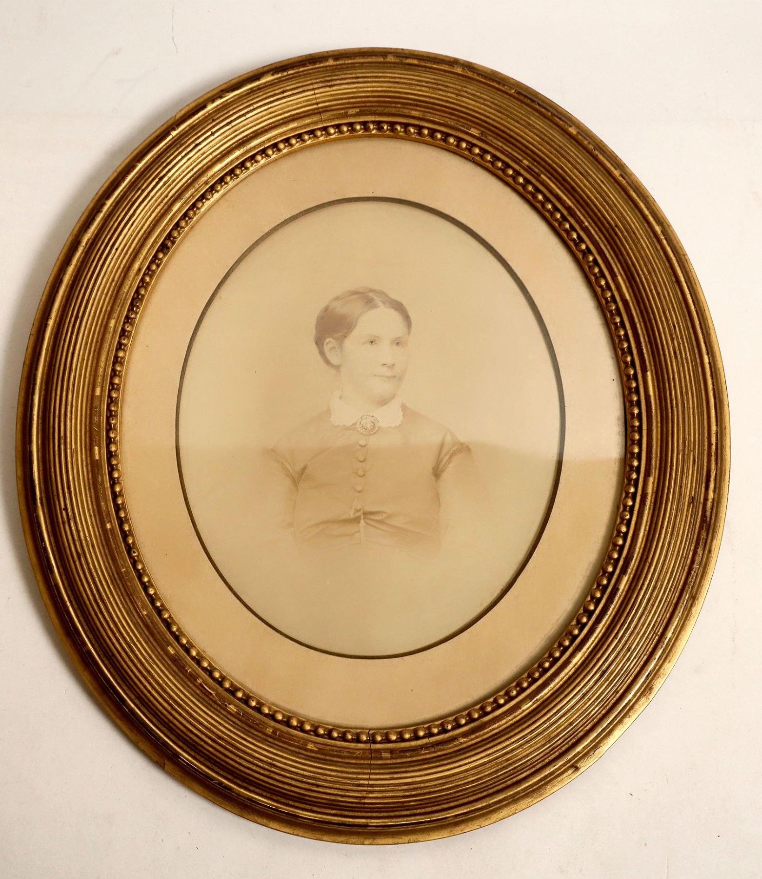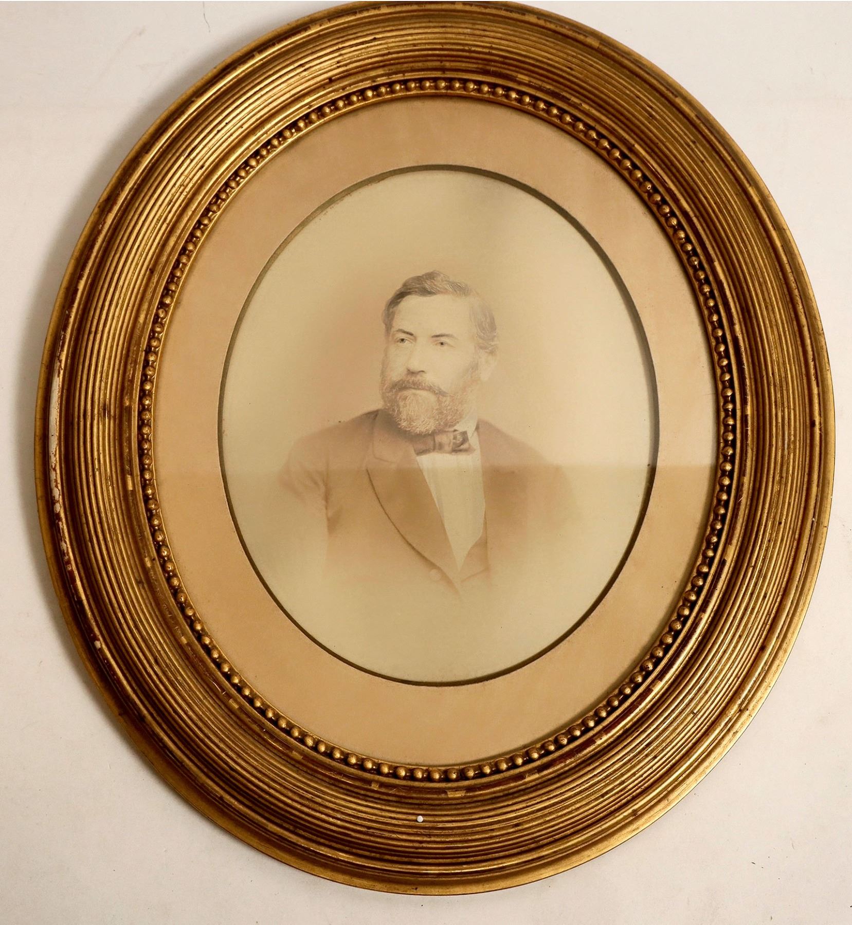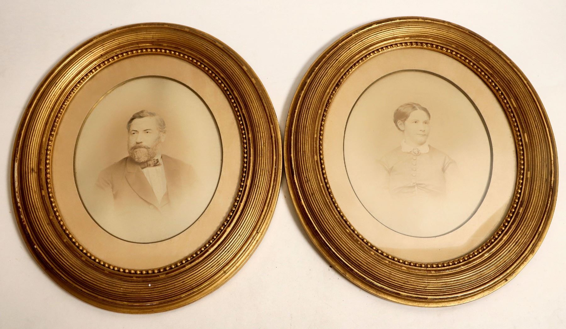 Two oval framed photographs of an apparent husband and wife. Pictures measure 15"x 18" and are in decent condition. So, you can hang them on the wall and claim they're rich relatives. Please see photos for more details.