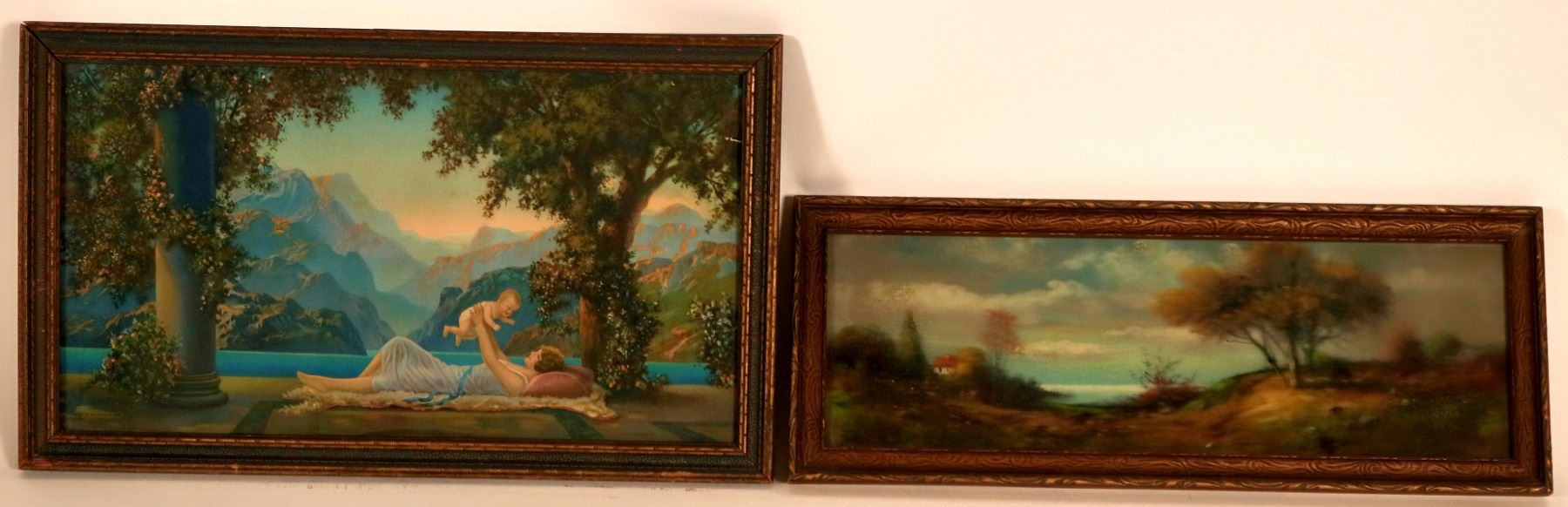 1) Vintage lithograph in original art deco frame, "Love's Paradise" by R. Atkinson Fox. Copyrighted, 1925, Chicago. Frame has minor damage: 11.5" x 19.75". Frame has minor damage. 2) This piece appears like a blurred photograph, however it may have been blurred from an original painting. We can find no information about the artist or age. Framed art deco style: 7.5" x 19.5". Please inspect.