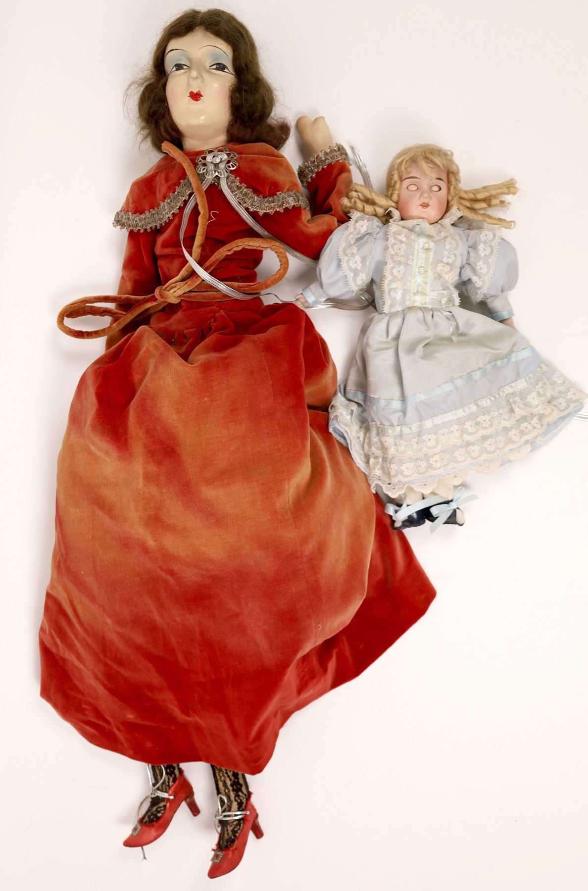 The first doll is 12in. tall and marked G DR 170K 9/0 by George Borgfeldt of Germany. She has blond hair in long curls a bisque head and arms. It is made with sleep eyes that close and has an open mouth. The head has been damaged and repaired very neatly. The body torso is covered in a doe skin leather and the name may be obscured by being clued down at the shoulders. The dress shows wear. Birthday unknown. The second doll is 29 in. tall, with a bisque head and painted eyes, human hair, sun faded red velvet dress, lace pattern hose and red shoes, C.1900-1920's, maker unknown. Please see photos for details. State: City: Date: Provenance: Salvatore Falcone Collection