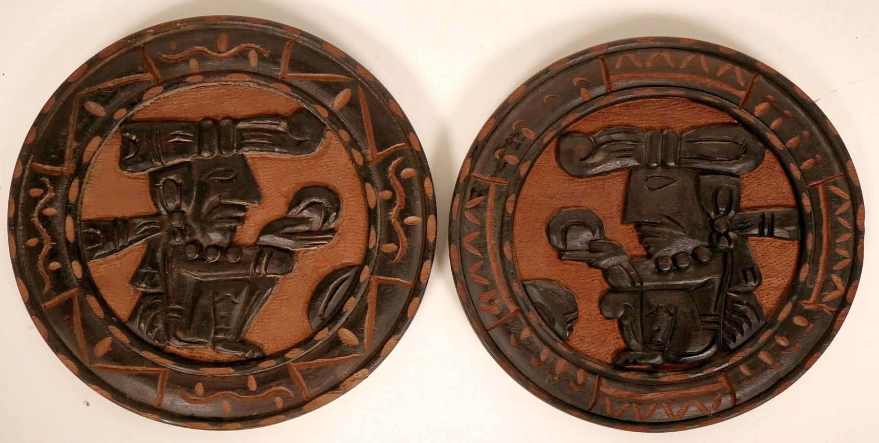 Round wood plaques of Tiki figures, hand-carved, 10" diameter. Tiki figures of certain gods and as an embodiment of that specific god's mana, or power. With well-formed tikis, perhaps the people could attain protection from harm, strengthen their power in times of war and be blessed with successful crops.