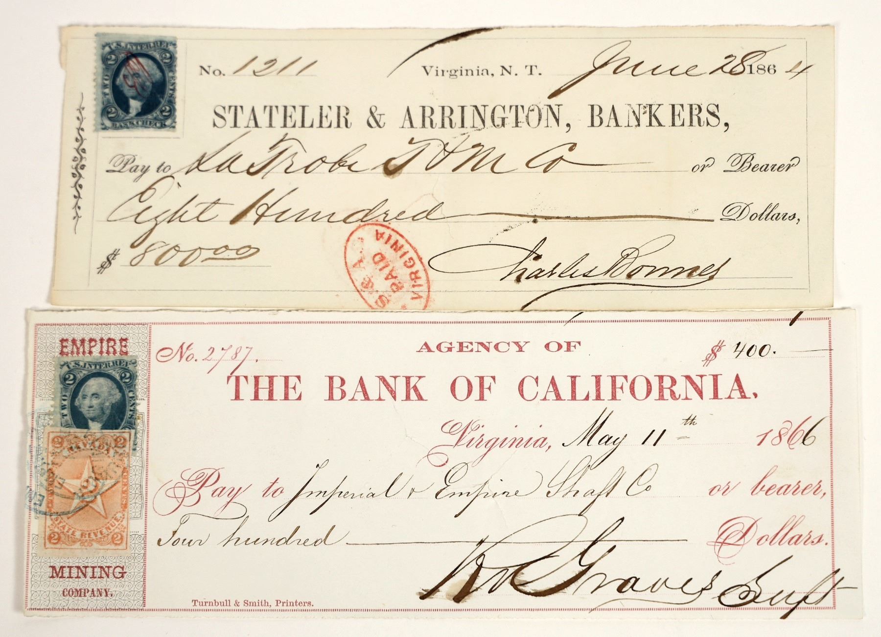 Lot of 2 different early checks both issued to mining companies. 1) 1864 Gould & Curry Mining Co. territorial check issued to Latrobe Tunnel & Mining Co. from Charles Bonner. Latrobe is mentioned by Mark Twain in one of his letters (he toured it and collected mica or sellinite crystals. 2) 1866 Empire Mill & Mining Co. check issued to Imperial & Empire Shaft Company. NV and US IR stamps. Signed by RN Graves as supt.