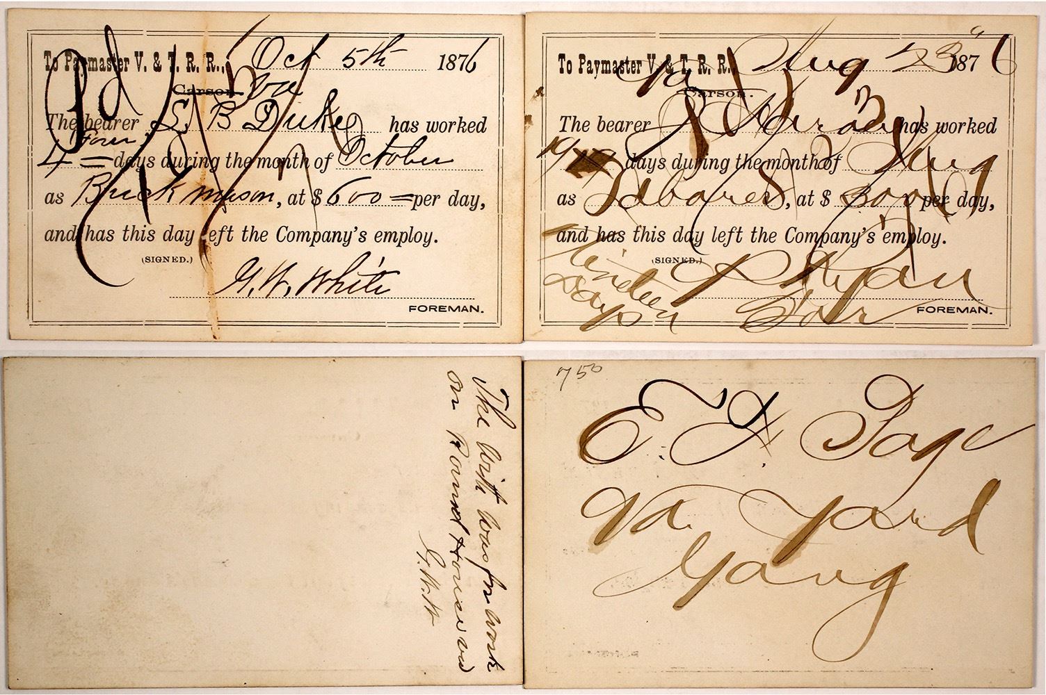 1) Issued Aug. 23rd, 1876 for a laborer who worked 19 days ($3 a day). Signed by the foreman. Back says E.J. Page, Va. Yard Gang. 2) Issued Oct. 5th, 1876 to L.B. Dukes for work as a brick mason ($6 per day). Signed by foreman White. Reverse says for work done at Mound House. Both cards printed on cardstock. (Potter Collection) Date: Location: Virginia City, Nevada HWAC# 60326