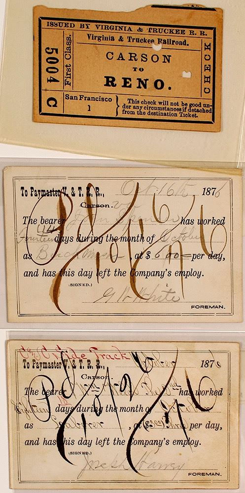 Two pay cards issued October 1876. One worker was a laborer on the C&C sidetrack, signed by foreman Harvey. The other was a brick mason, signed by foreman White. Printed on cardstock. (Potter Collection) HWAC# 59958 Date: Location: Virginia City, Nevada
