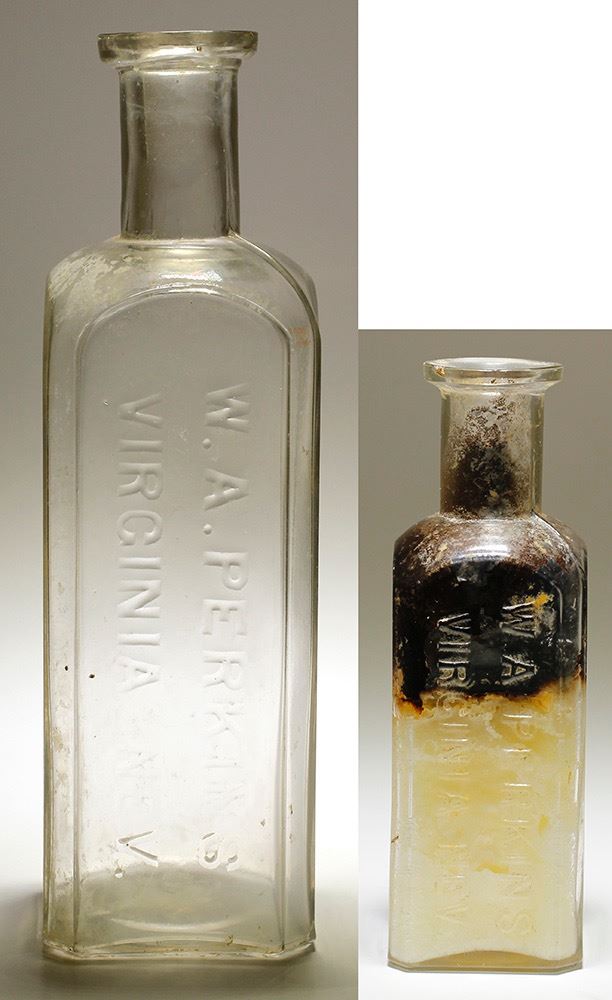 ( Lot of 2 ) : Lot#1 of 2 : W. A. Perkins / Virginia Nev // Clear , tooled top, base flat. 5/1/2" x 1 7/8" . Flint glass, early. Good condition, except for an 1/4' bubble on the base edge, that is partially open. Light haze in the shoulder area, and left side. Otherwise nice. lot #2 of 2 : Smaller bottle, 4 1/4" x 1 3/8 ", FULL, with cream and black contents. Minute bit of lip roughness. Other wise good. HWAC# 59221 Date: Location: Virginia City, Nevada