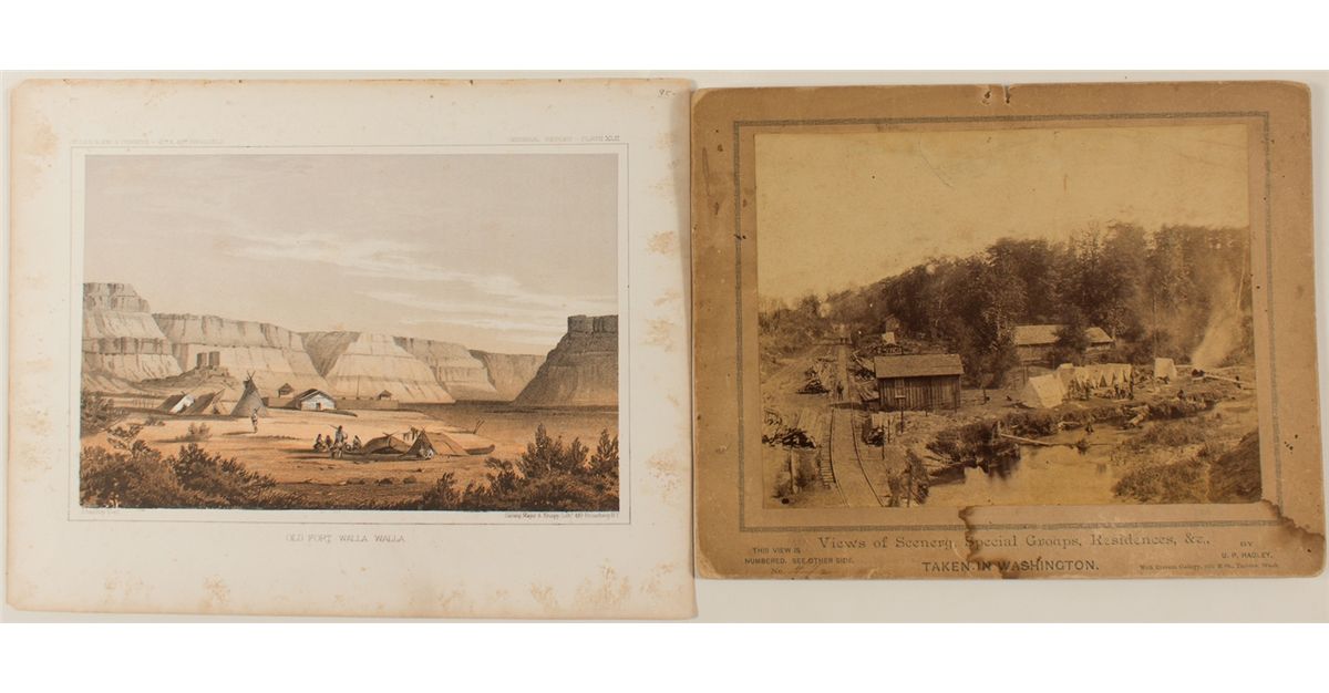 1) U. P. Hadley photograph of soldiers camped by a railroad siding. 8 x 6". This photograph was taken near the Gilman Mines in 1892 during the Miner's Strike. Comes with a nice historical reference on these events from the Tacoma Public Library. Border stained and photograph has issues in top center, but a great historical piece. 2) Old Fort Walla Walla done during the 47th and 49th parallel survey. Again border stained, but photograph itself in nice condition.