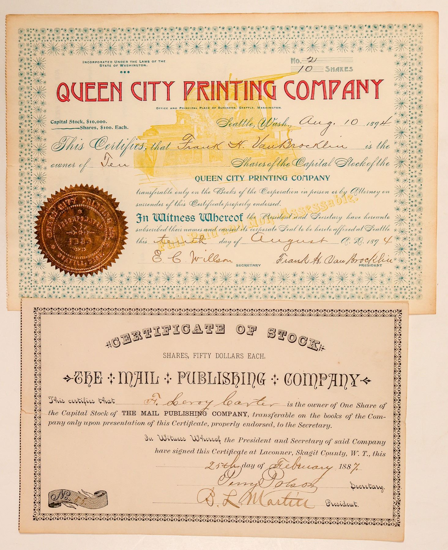 Lot of 2 different. 1) The Mail Publishing Company. No. 55, issued for one share to F. Leroy Carter on Feb. 25th, 1887 at Laconner, Skagit County, W.T. Signed by president BL Martin and secretary Perry Polson. Not cancelled. Folds, tear along left fold. 2) Queen City Printing Company. Low number 2, issued for 10 shares to the company president, Frank H. Van Brocklin, on Aug. 10th, 1894 in Seattle. Also signed by secretary Wilson. Not cancelled. Blue border and print, red title, gold seal, underprint vignette of printing press. Horizontal fold. Ken Prag Collection