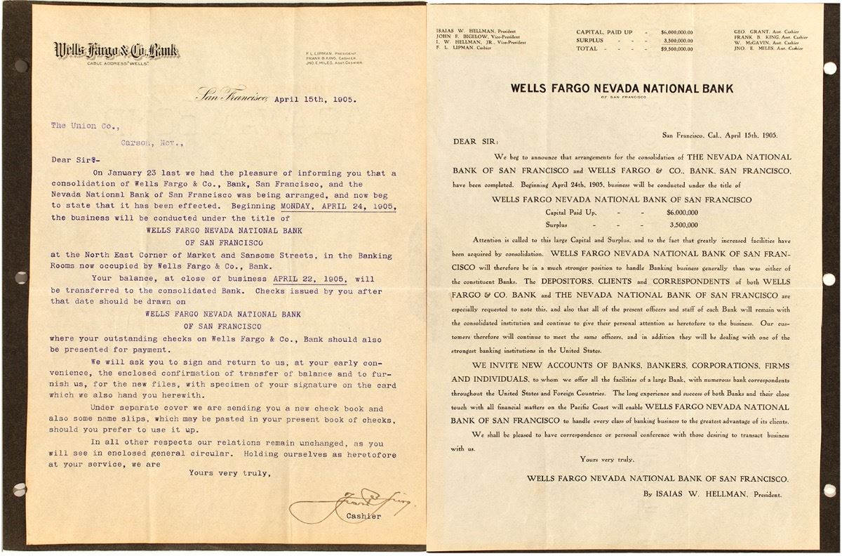 These letter sized handbills are about the merger of the Nevada National Bank of San Francisco and the Wells Fargo & Co. Bank of San Francisco. One is generic and the other is addressed to the Union Company of Carson City, Nevada. City: San Francisco State: California Date: 1905 hwac# 22773