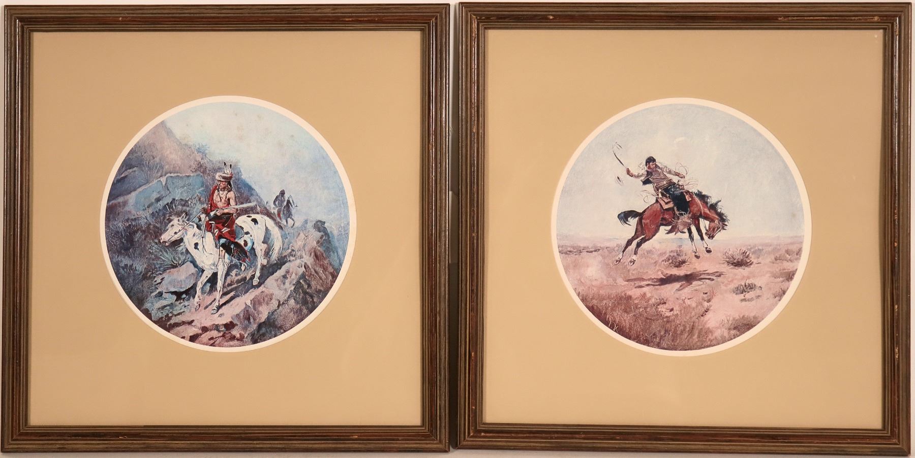 Both are round images, offset printing from original paintings, matted and framed: 17" x 17". 1) Indians riding down a steep and treacherous train. 2) Cowboy on bucking horse. Bothe are somewhat faded prints. Good condition.